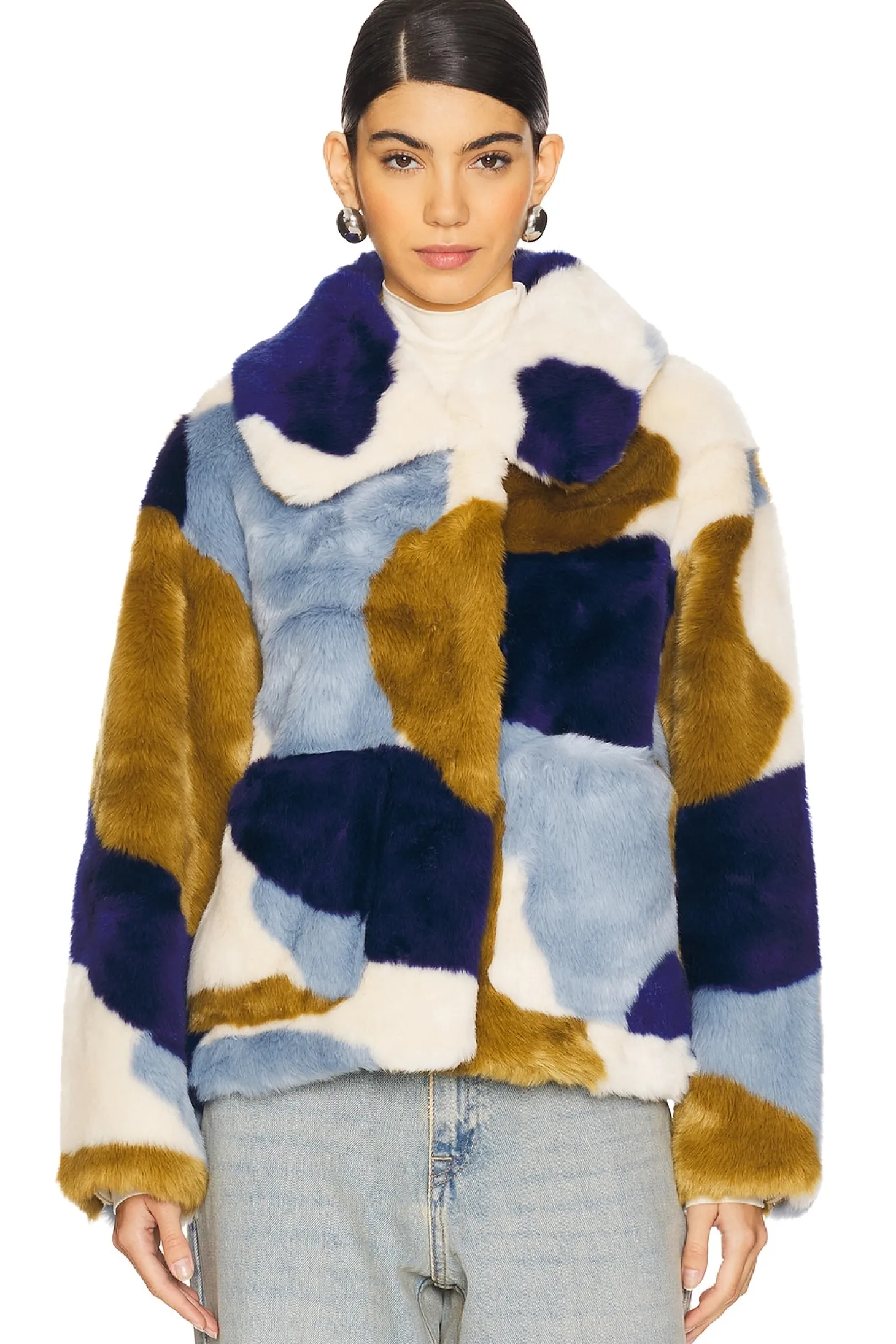 Self 1: 50% acrylic 50% modacrylic Self 2: 100% recycled polyester Lining: 45% viscose 55% recycled polyester.Made in China.Dry clean only.Front snap closure.Front slip pockets Notched lapel collar.Heavyweight faux fur fabric