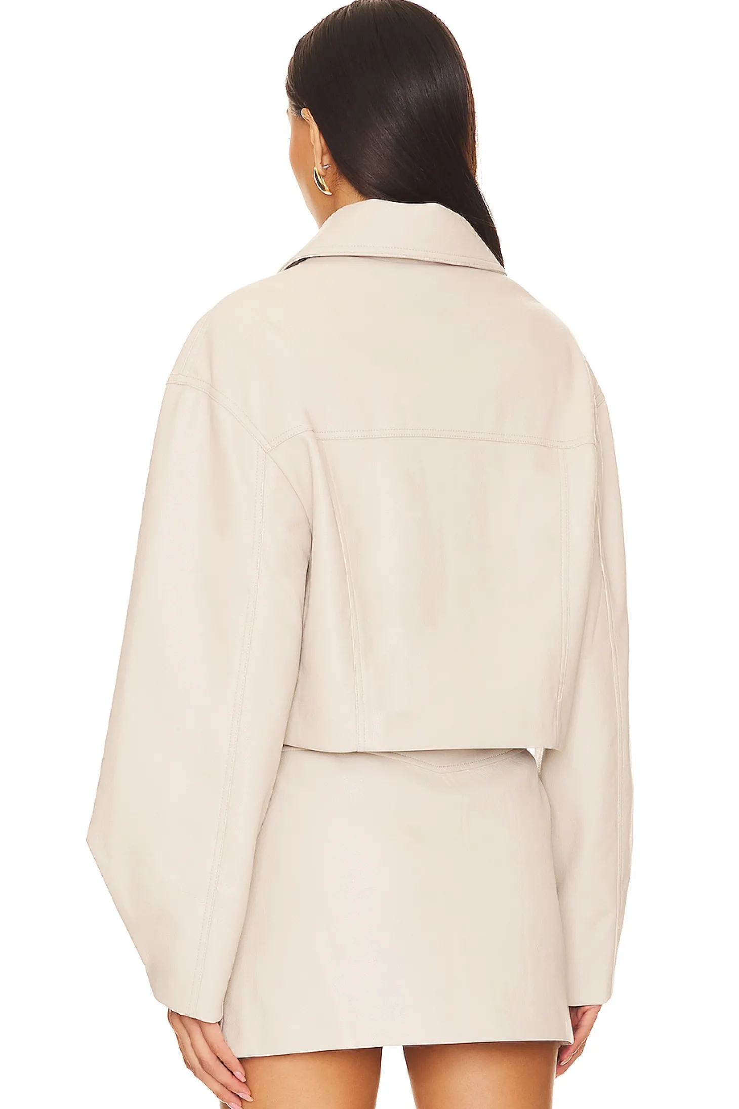 Self: 55% polyurethane 45% polyester Lining: 100% polyester.Made in China.Dry clean only.Front zipper closure.Breast flap pockets.Faux leather fabric.Item not sold as set