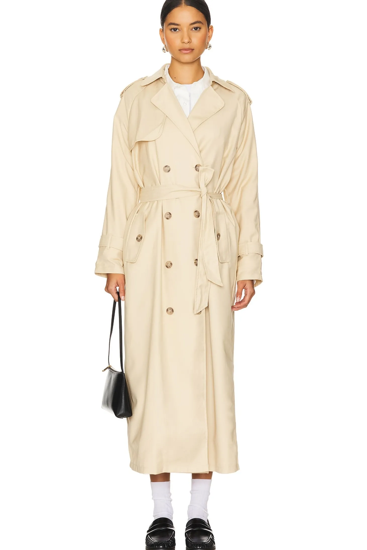 80% polyester 20% rayon.Made in China.Hand wash.Double breasted closure with optional waist belt.Side seam pockets.Buttoned cuffs.Twill fabric