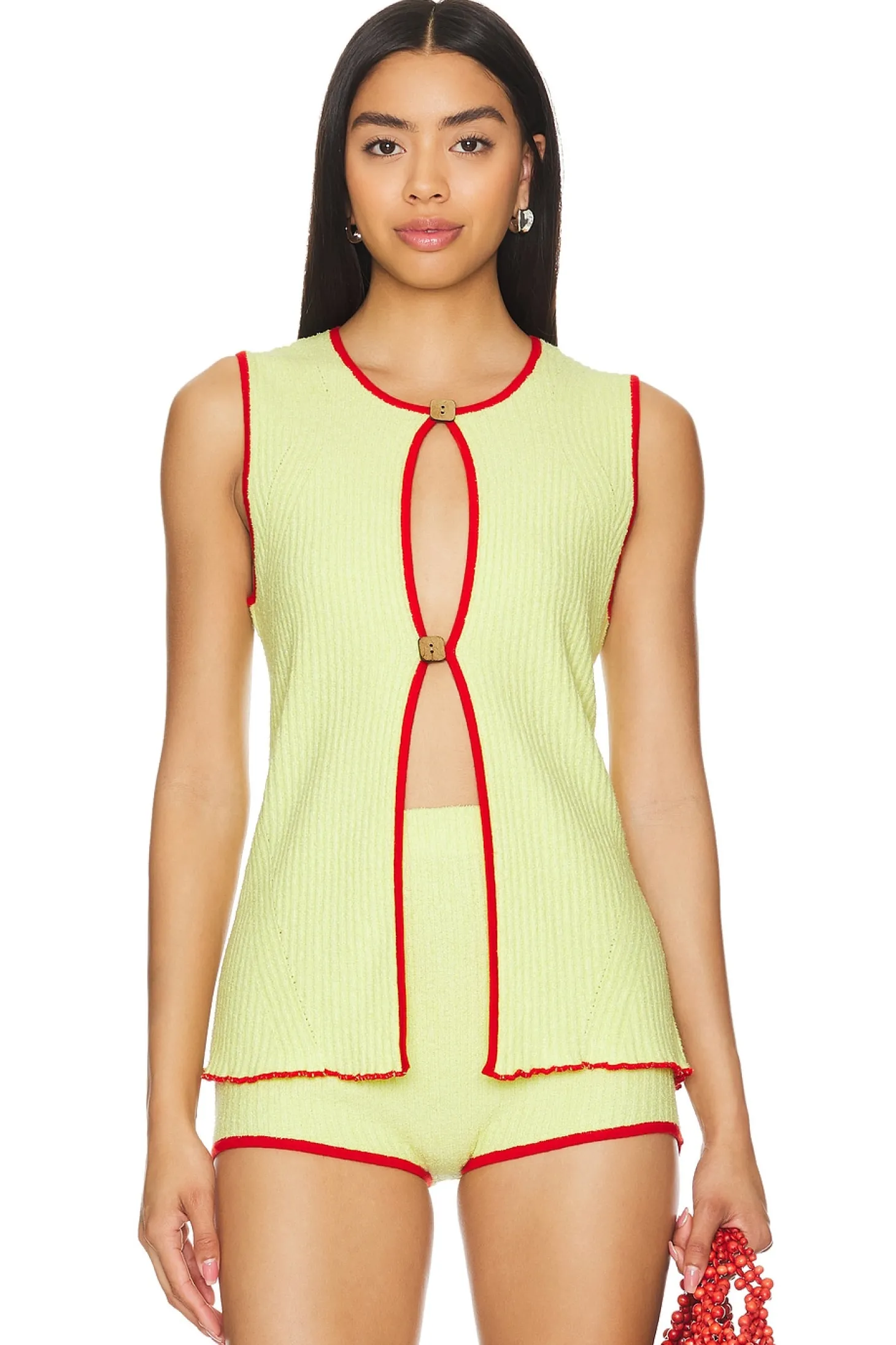 58% recycled nylon 42% cotton.Made in China.Machine wash.Front loop button closure.Lightweight ribbed French Terry fabric.Item not sold as a set