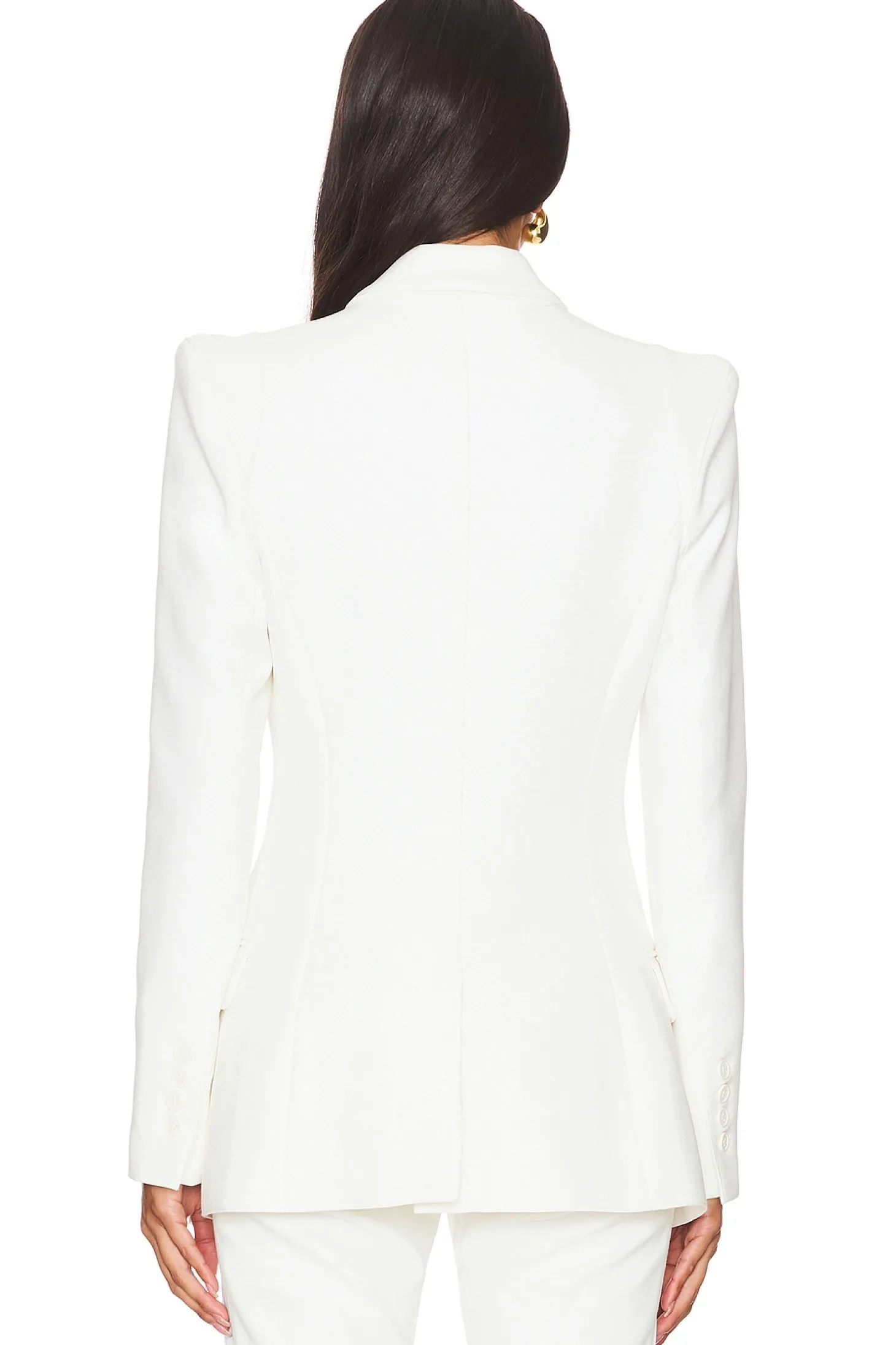 Self: 84% cotton 9% polyester 7% other fibers Contrast: 100% leather Lining: 100% rayon.Made in Canada.Dry clean only.Double breasted closure.Front flap pockets and breast pocket.Buttoned cuffs.Twill fabric with padded shoulders.Item not sold as set