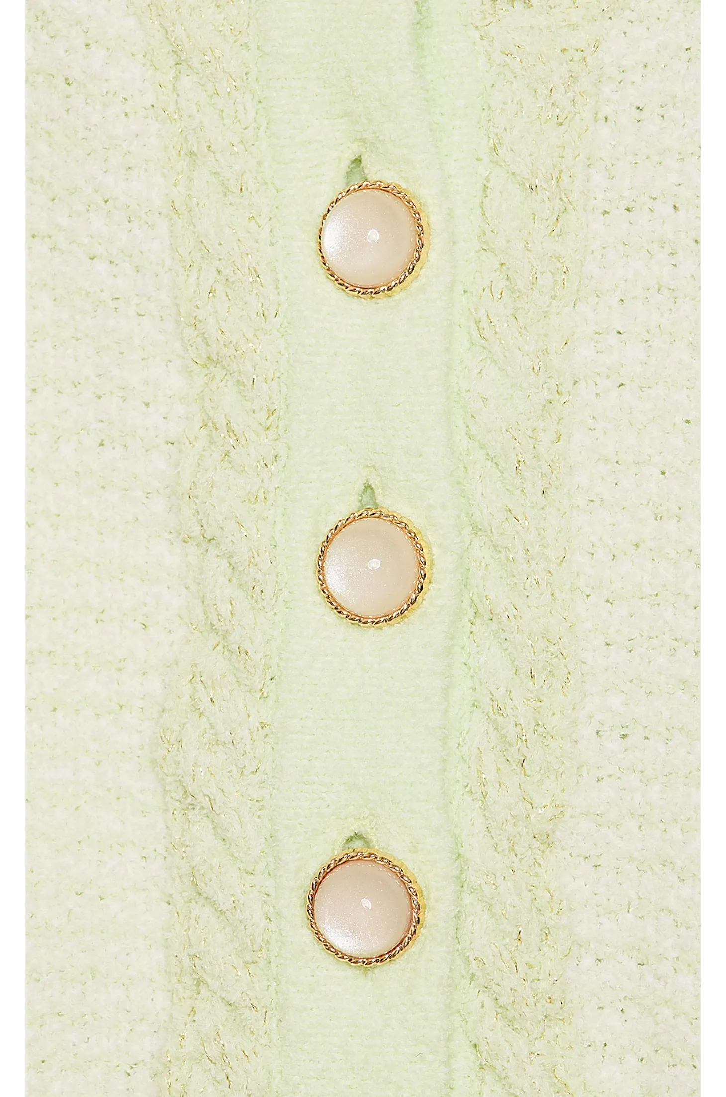 79% BCI cotton 21% nylon.Made in China.Hand was recommended.Pearlescent front button closure.Boucle knit fabric with metallic threading.Item not sold as a set