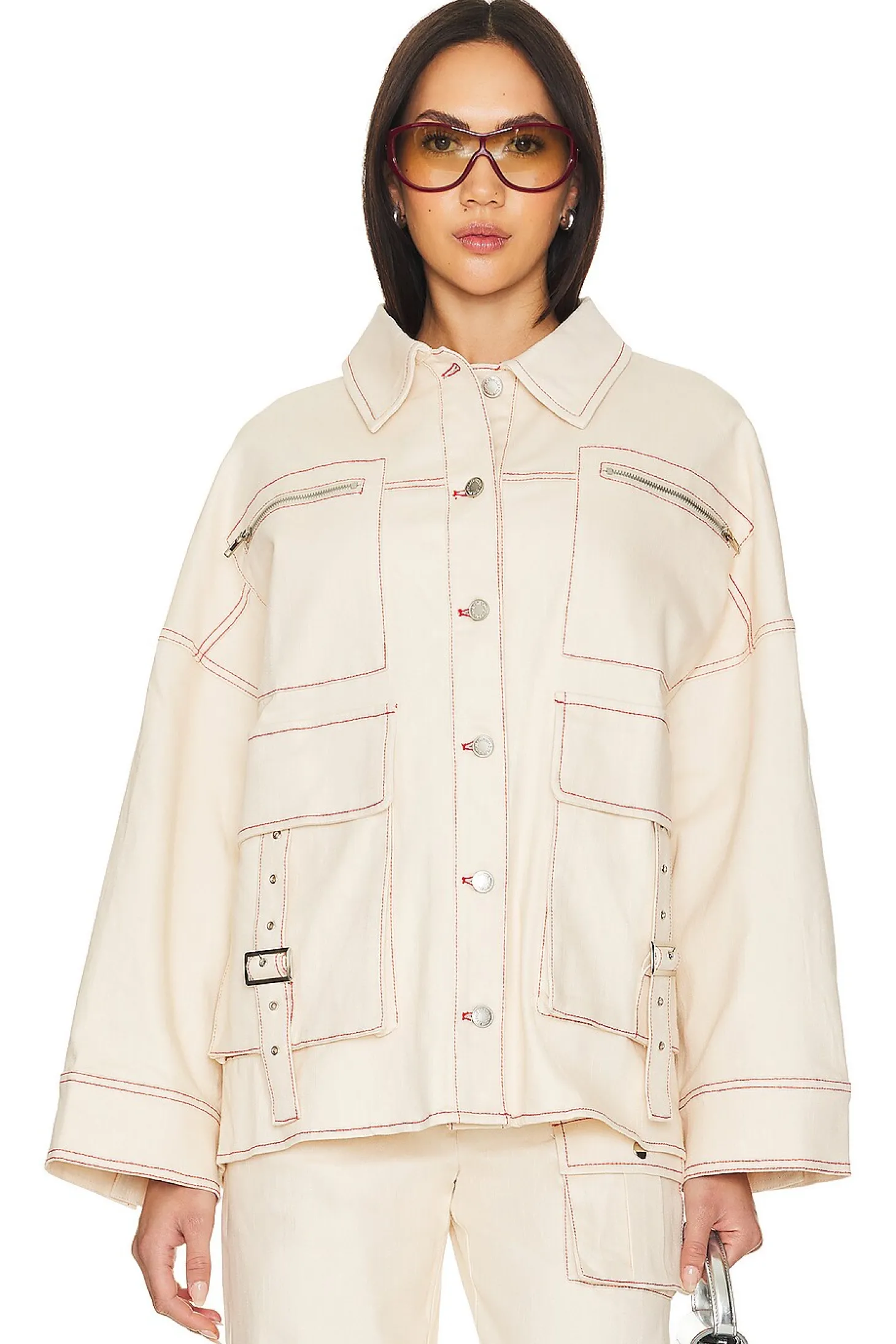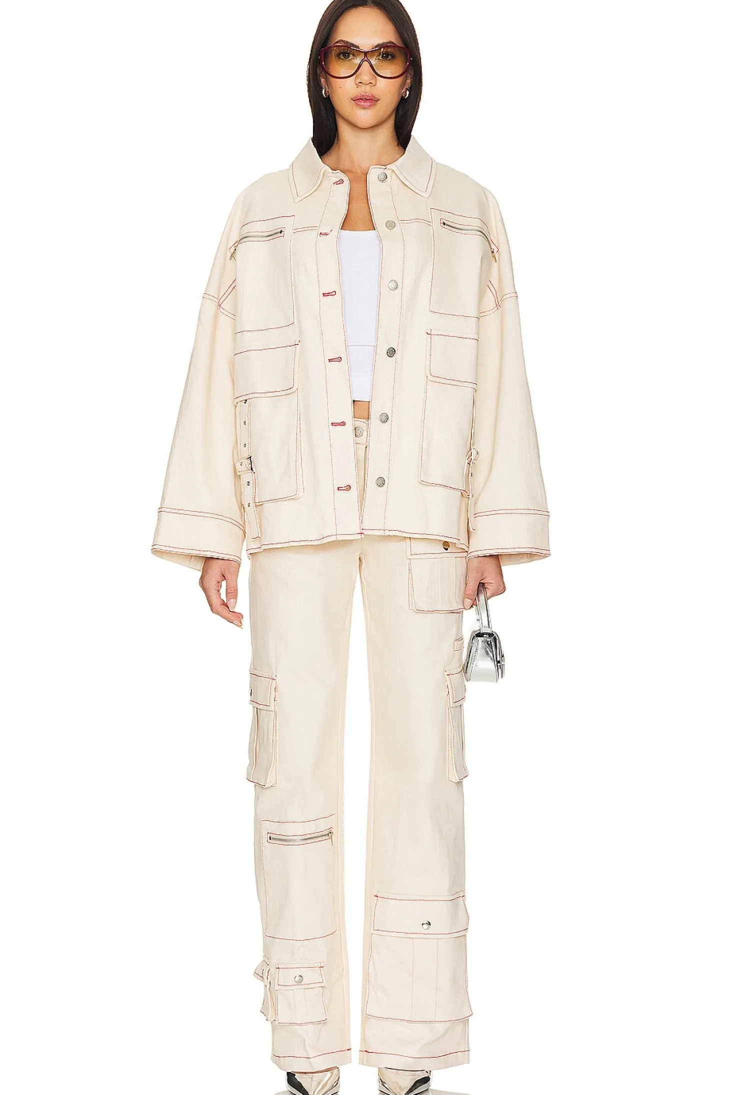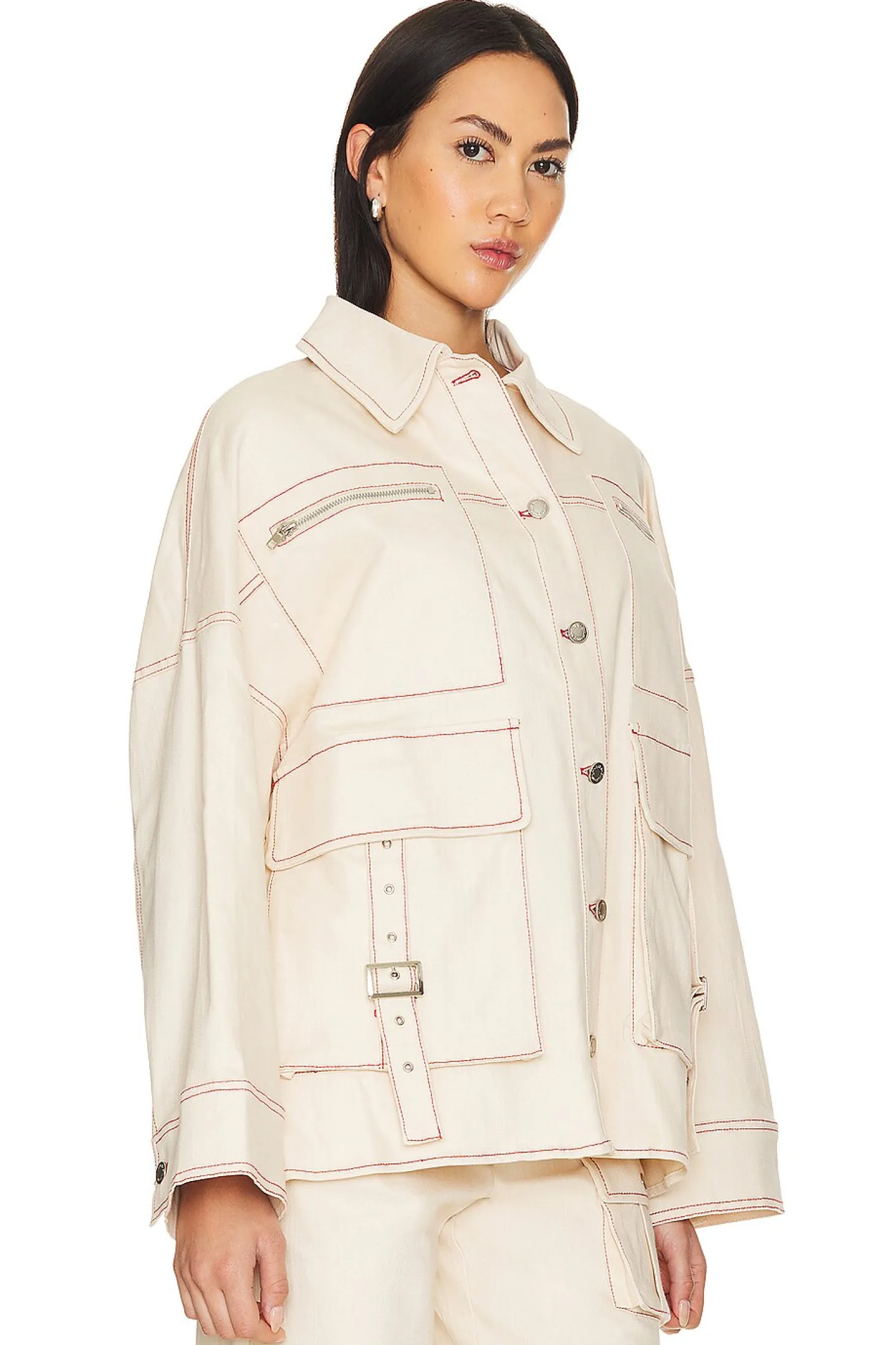 97% cotton 3% elastane.Made in China.Machine wash.Front button closure.Breast zipper pockets.Side flap pockets with adjustable buckle strap.Rigid denim fabric.Item not sold as set