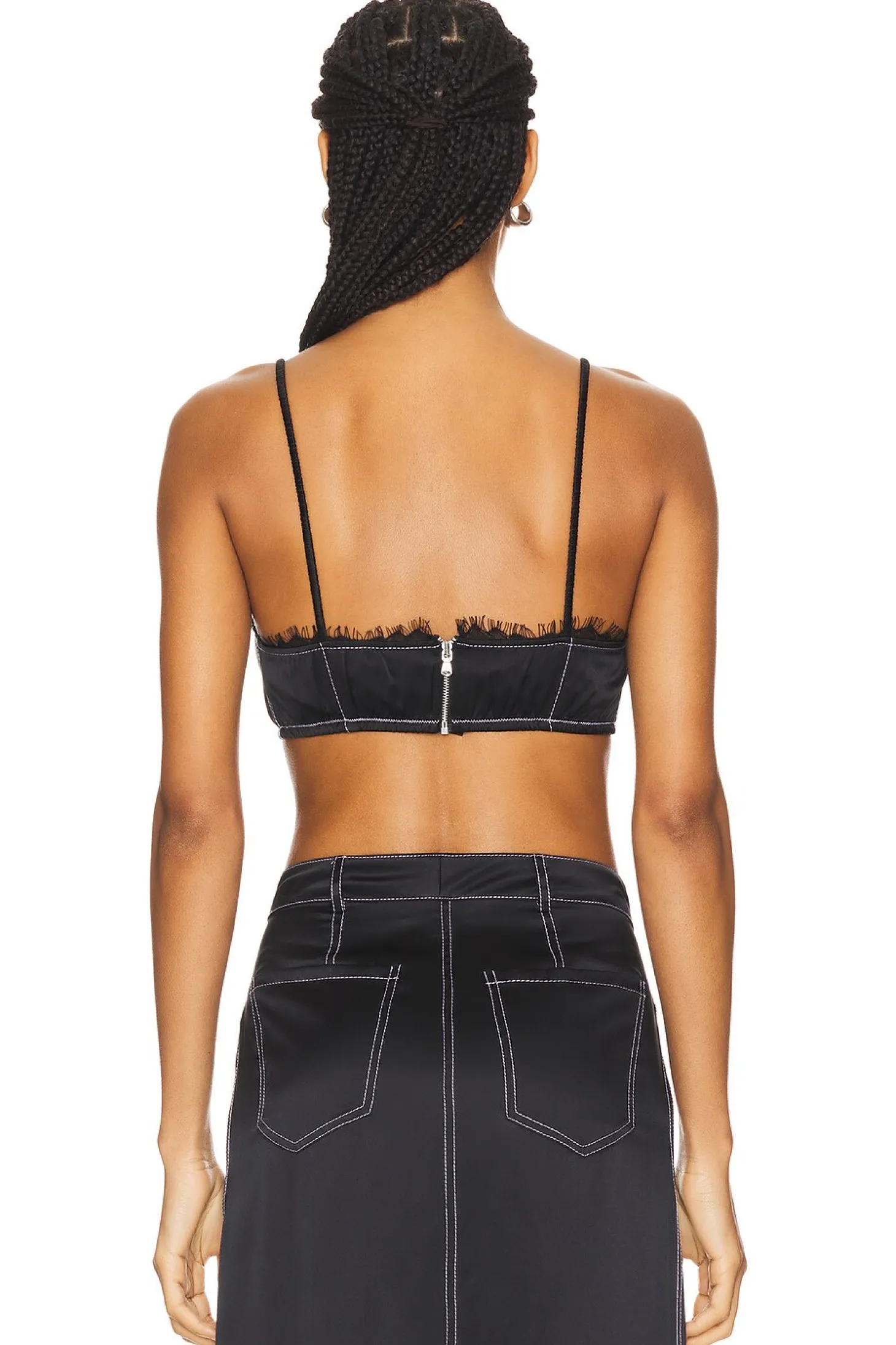 Self: 92% silk 8% elastane Combo: 100% nylon Lining: 78% polyamide 22% elastane.Made in China.Hand wash.Unpadded cups.Exposed back zipper closure.Elastic shoulder straps and waistband.Satin fabric with lace trim.Item not sold as set