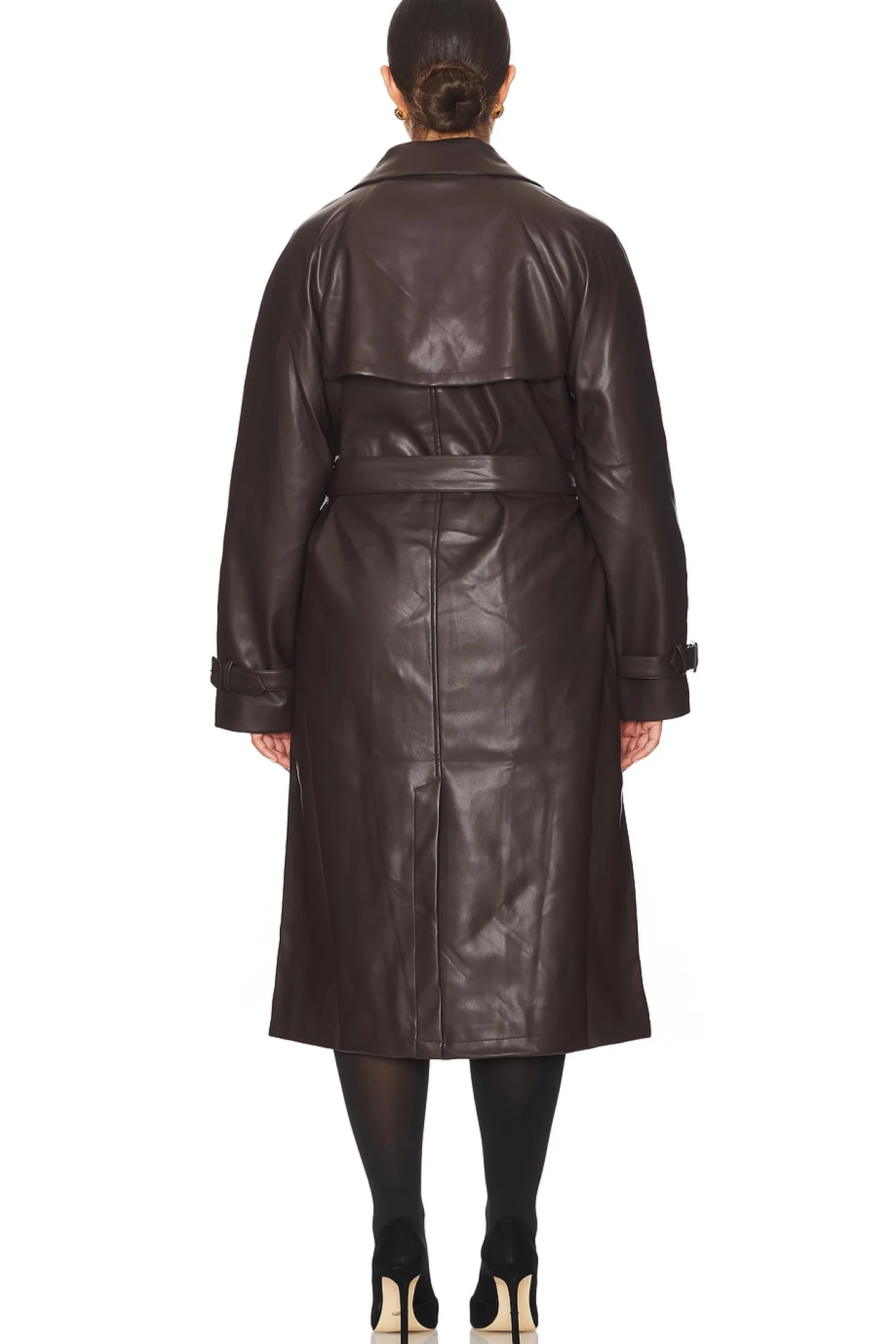 Self: 100% polyurethane Backing & Lining: 100% polyester.Made in China.Hand wash.Front button closure.Attached waist tie.Side slant pockets.Buckle cuffs.Midweight faux leather fabric