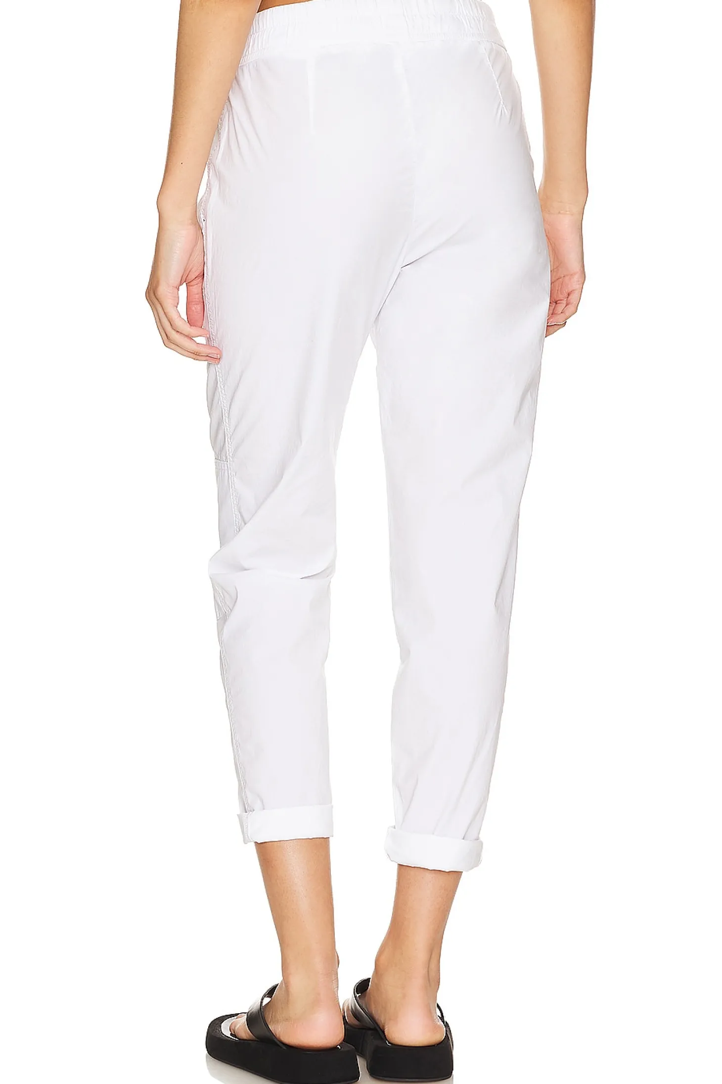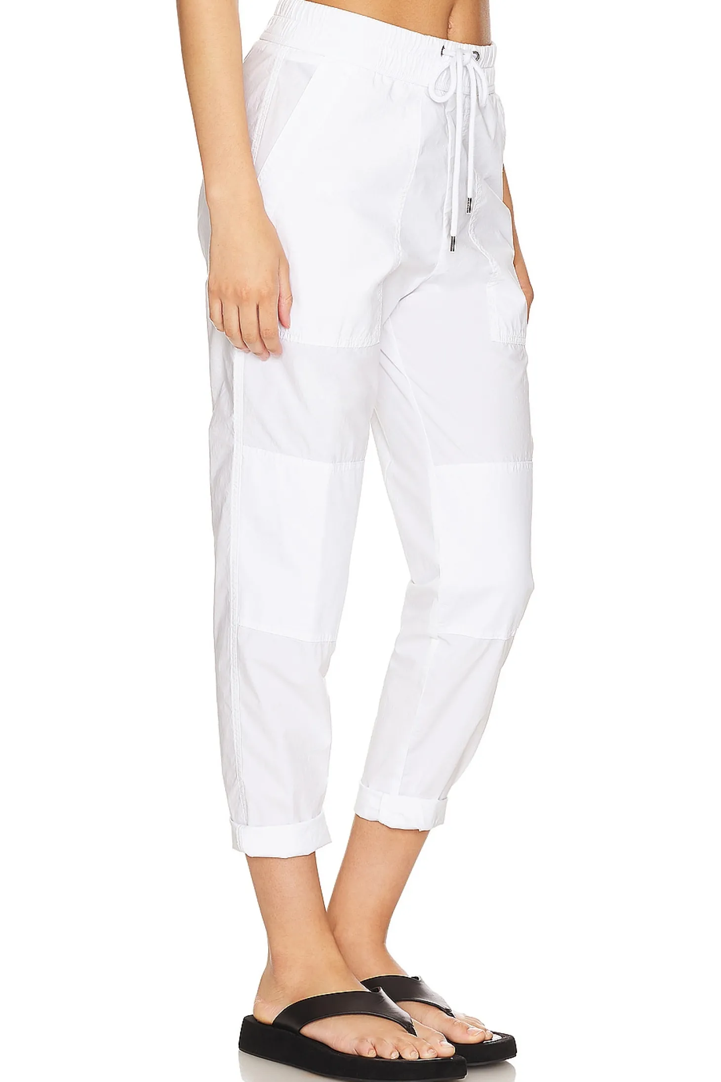 Self: 96% cotton 4% elastane Contrast Fabric 1: 60% lyocell 40% cotton Contrast Fabric 2: 97% cotton 3% elastane.Made in China.Machine wash.Drawstring closure.Side seam pockets.Lightweight poplin fabric.16" at the knee narrows to 10" at the leg opening