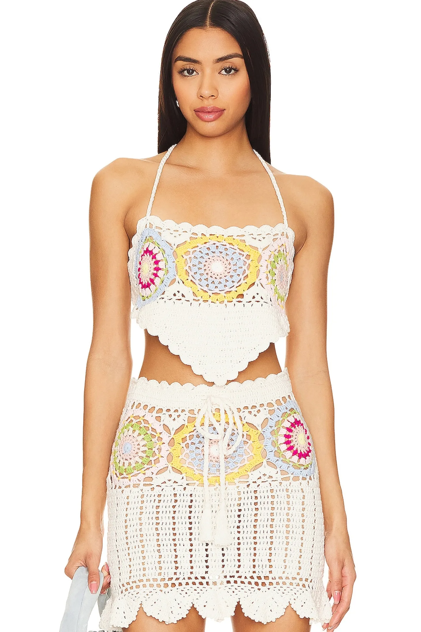 Turn heads in this stand-out top, adorned with a stunning crochet fabrication and design. The super strappy back adds a special touch, making it a true statement piece. From daytime chic to the dance floor glamour, this top is designed for versatility. For the ultimate look, pair it with the matching skirt (sold separately)..100% cotton.Made in China.Hand wash.Halterneck and back tie closure.Midweight crochet fabric.Item not sold as a set