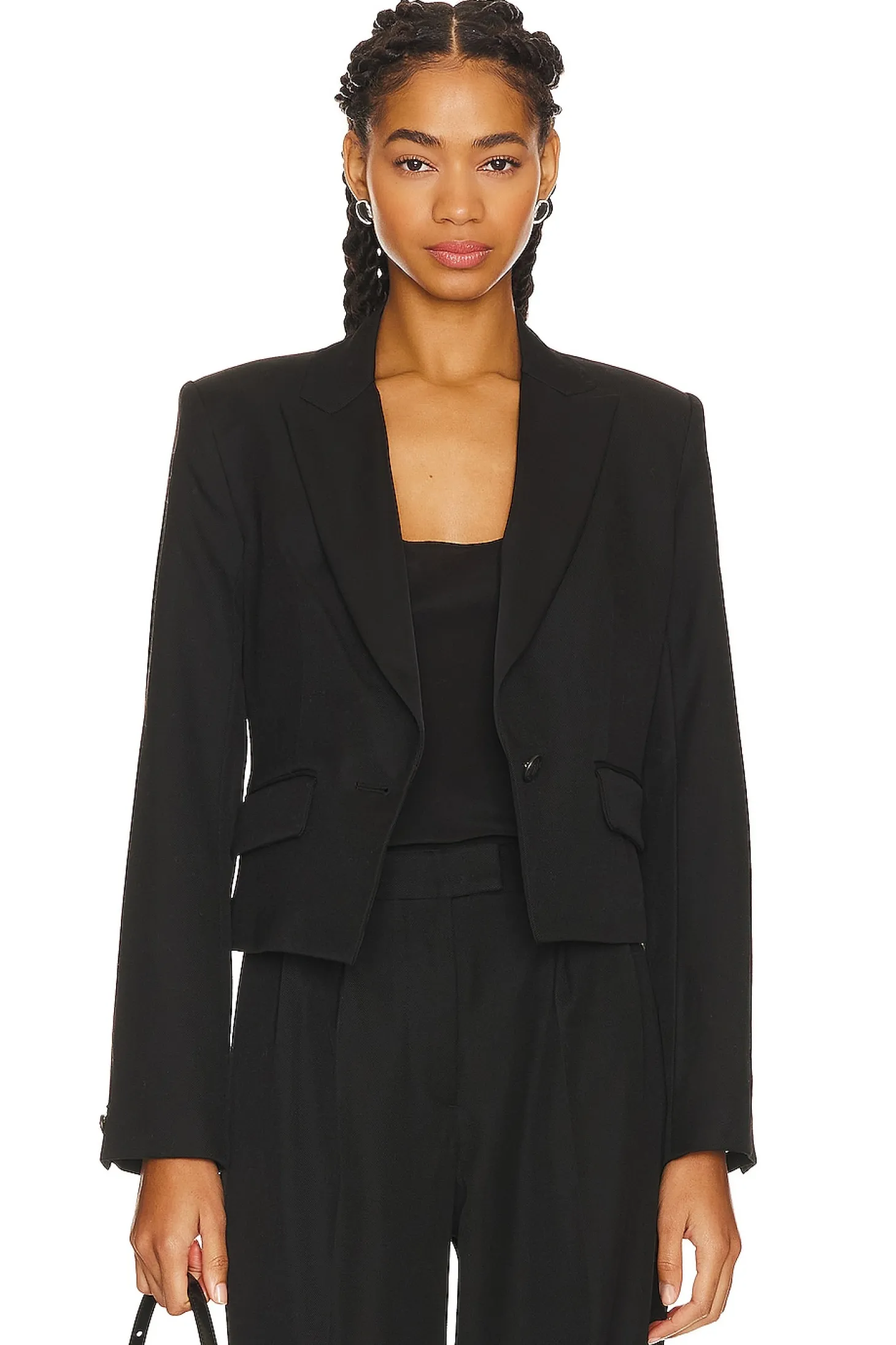 Self: 100% wool Lining & Contrast Fabric: 100% polyester.Made in Vietnam.Dry clean only.Singular front button closure.Padded shoulders with button cuffs.Twill suiting fabric