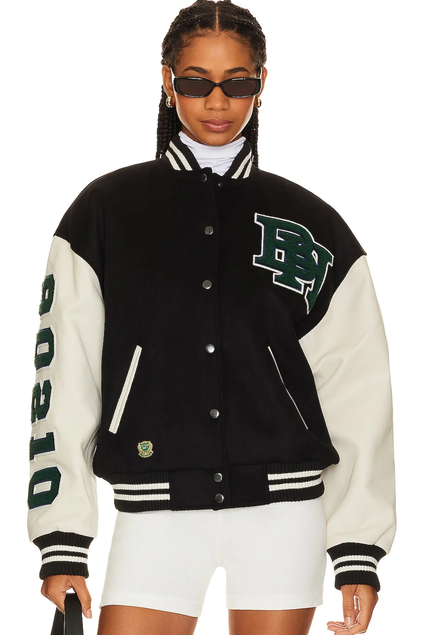 Self: 47% wool 44% polyester 5% acrylic 3% nylon 1% rayon Lining: 100% polyester Contrast Fabric: 100% cow leather.Made in China.Professional leather clean only.Front button closure.Side slant pockets.Melton fabric with 'BH' terrycloth patch.Faux leather sleeves with '90210' terrycloth patch