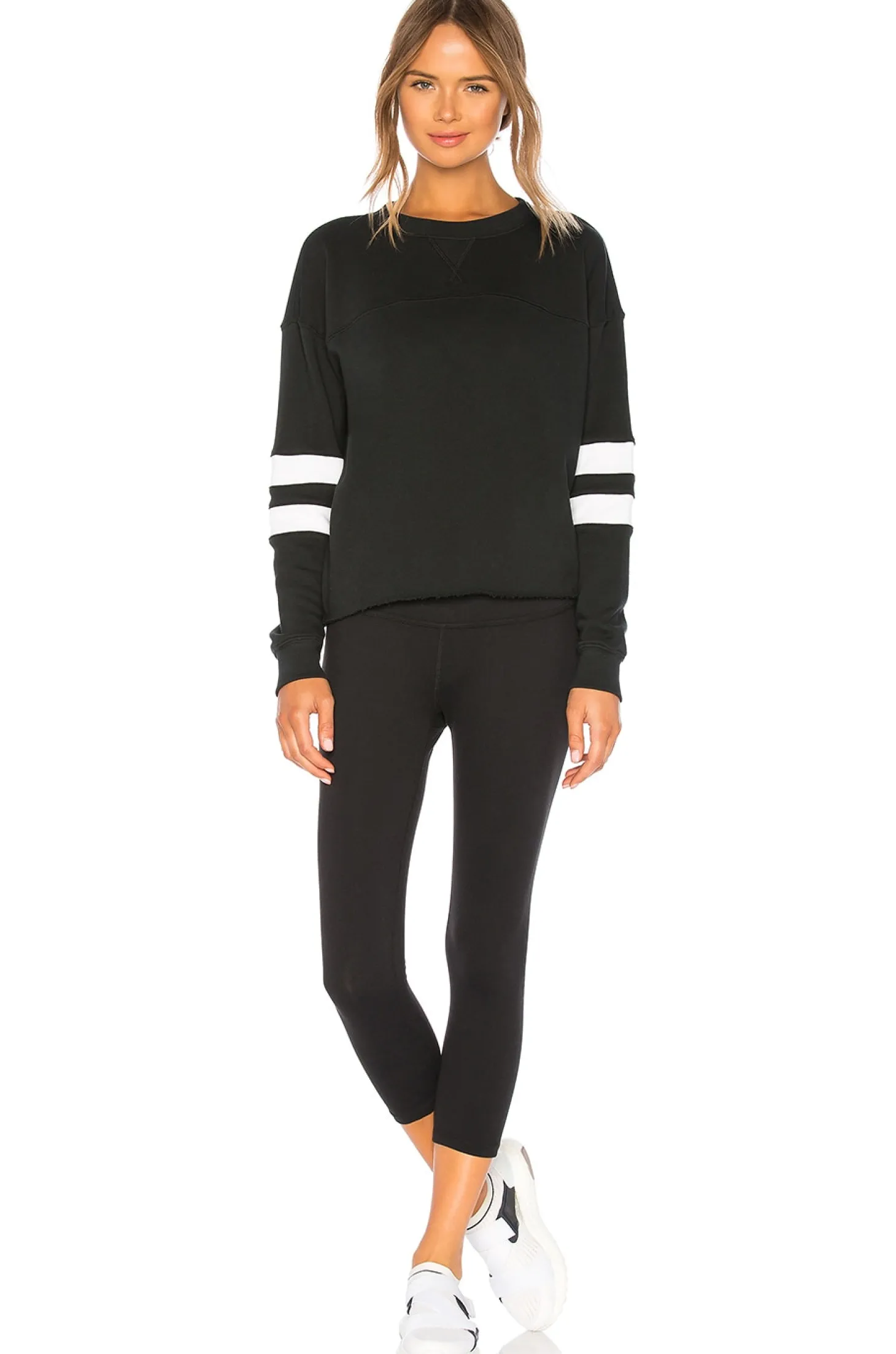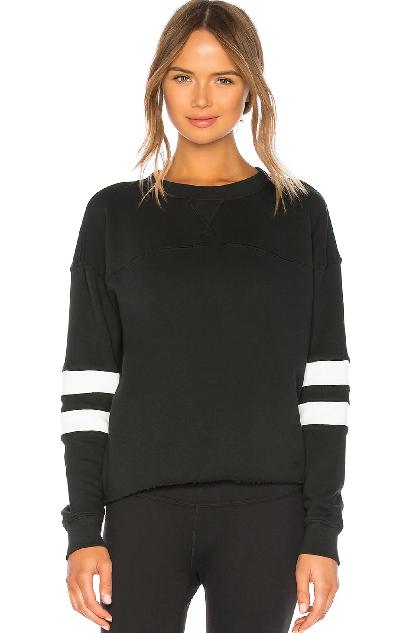 100% cotton.Sleeve striping detail.Ribbed trim.Raw cut bottom hem.Made in USA