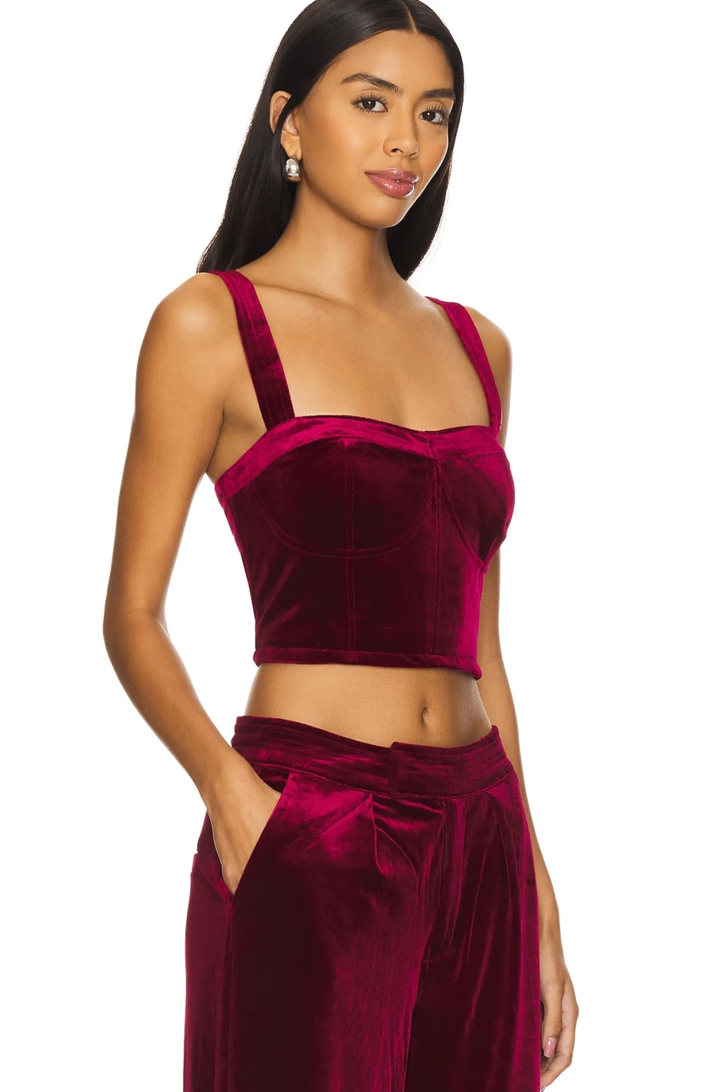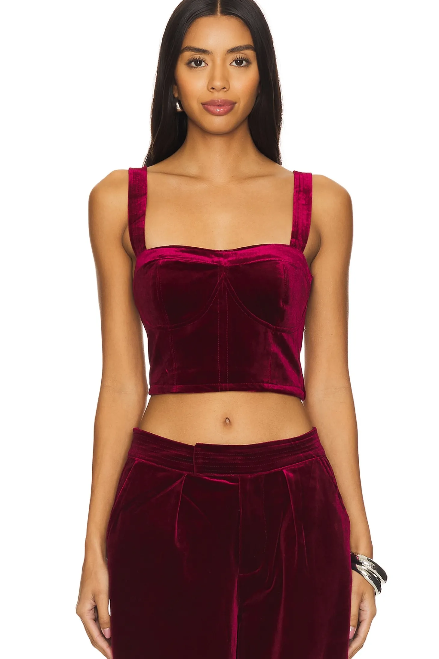 Self: 95% polyester 5% spandex Lining: 97% polyester 3% spandex.Made in China.Dry clean only.Hidden side zip closure.Adjustable shoulder straps.Midweight velvet fabric Item not sold as a set