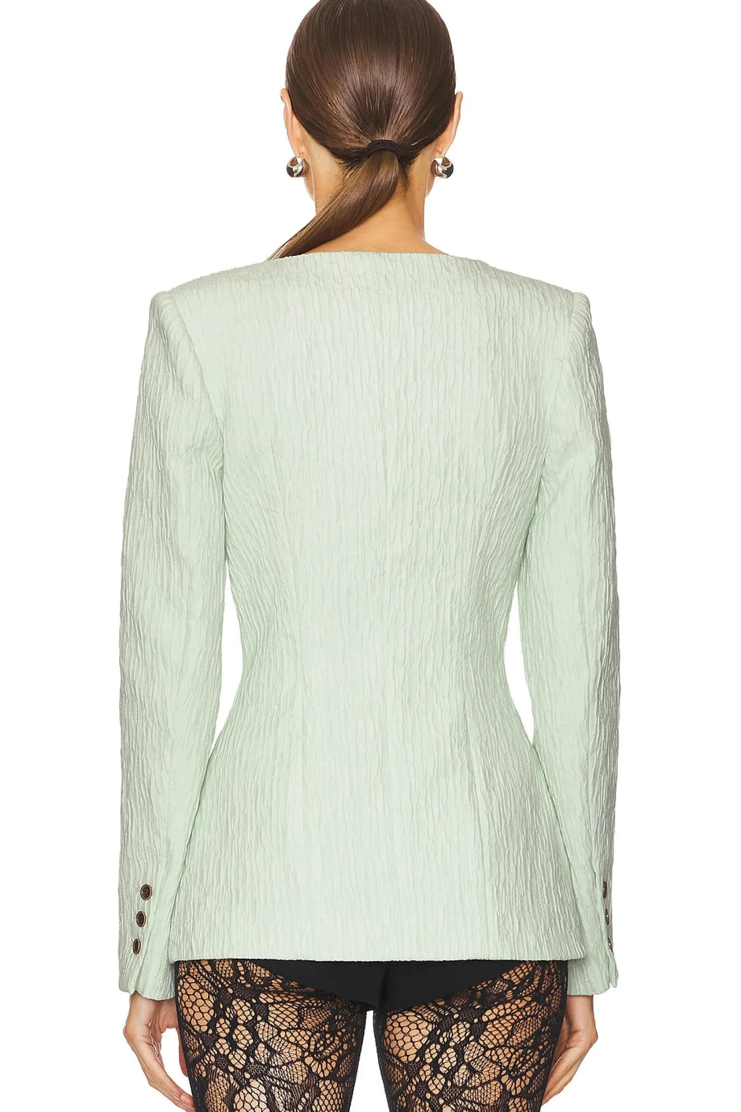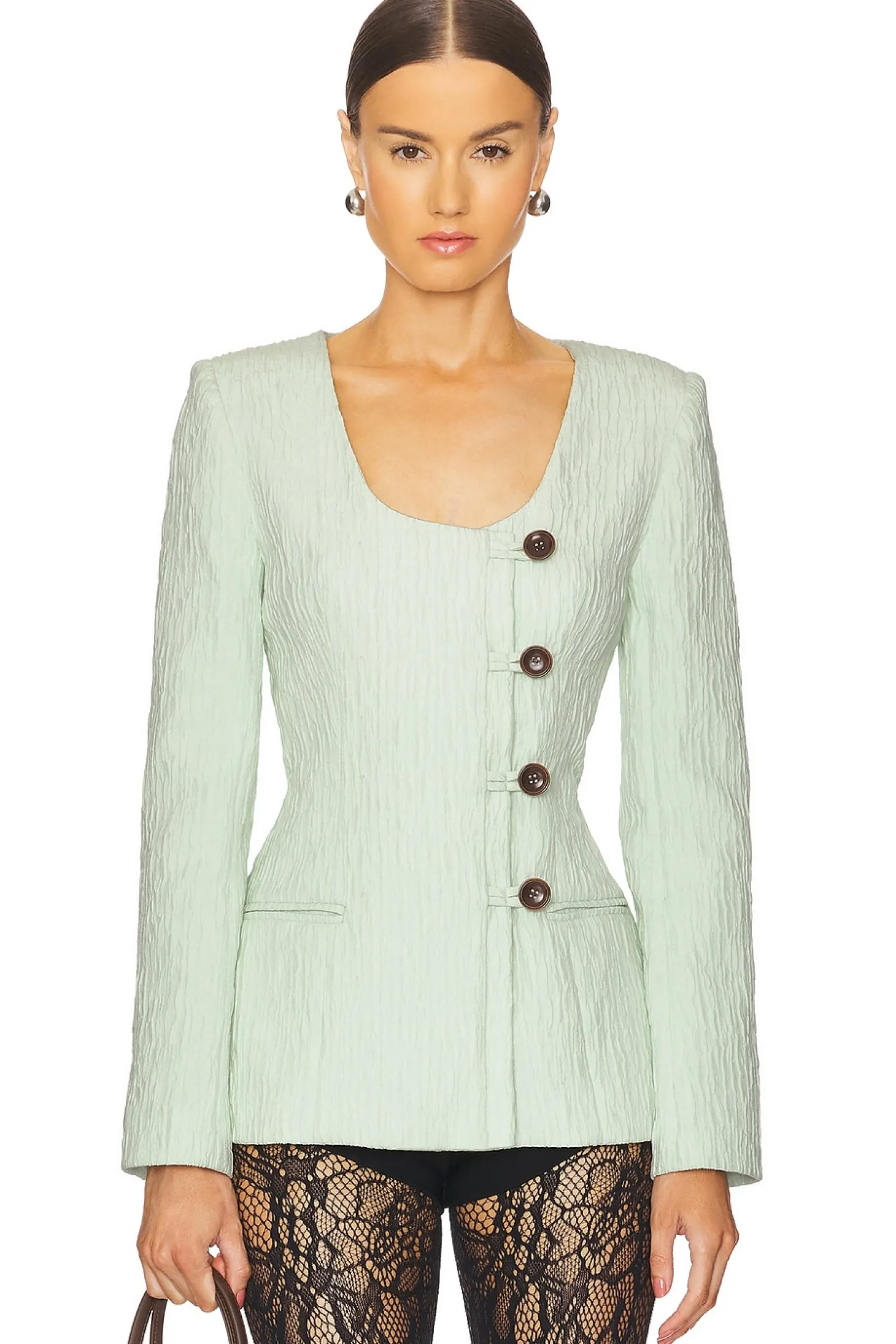 Taffeta textile.Imported.Dry clean only.Front button closure.Button cuffs.Padded shoulders