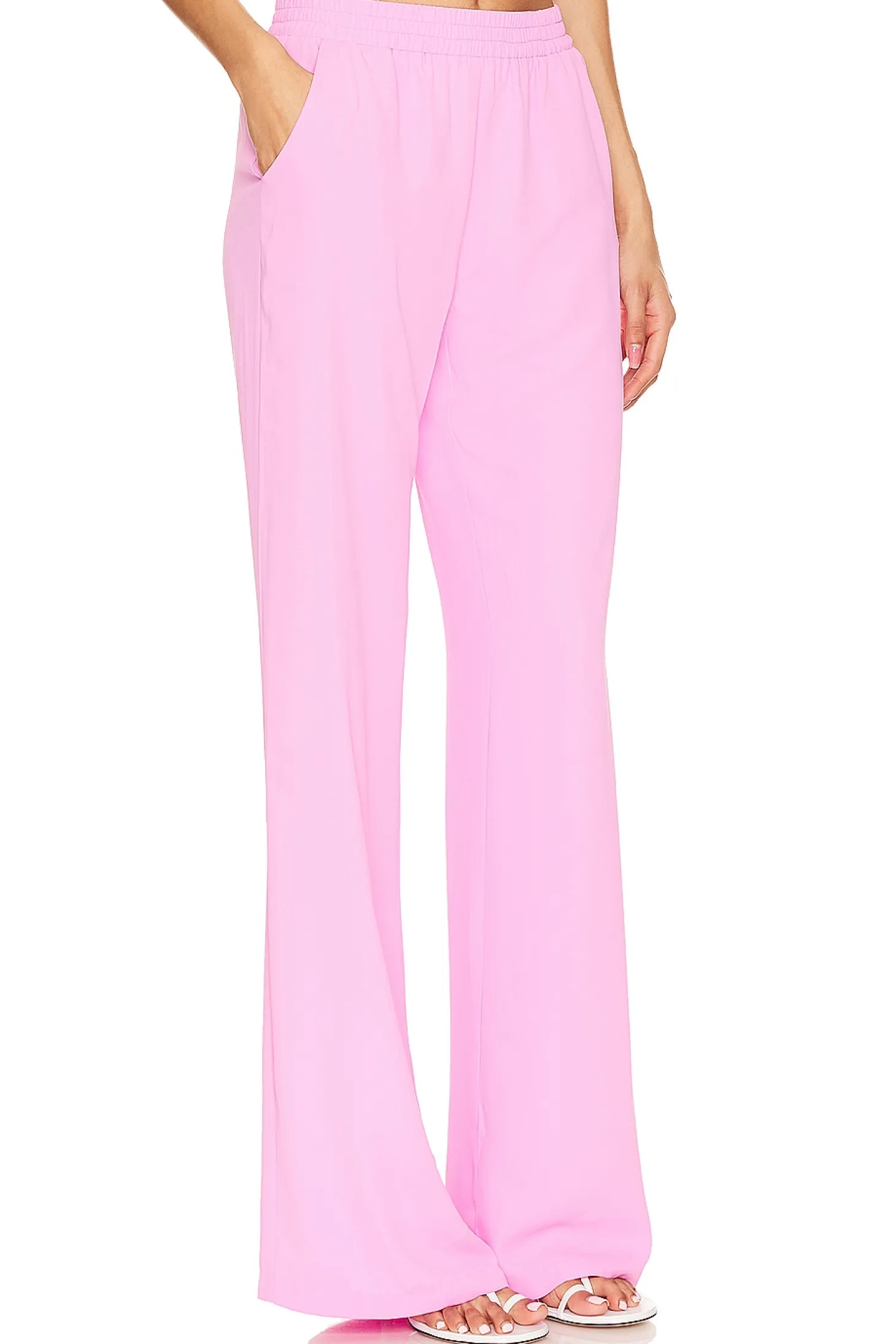 Radiate pink power in Amanda Uprichard's Vera Pants in Carnation. With an elastic waist, this pant means business with a touch of romance. Crafted from crepe fabric in a rosy hue, it's the perfect blend of power and femininity. Pucker up in pink and conquer your day!.100% polyester.Made in China.Dry clean only.Pull-on styling with elastic waistband.Side slant pockets.Crepe fabric Item not sold as set.22" at the knee breaks to 25" at the leg opening
