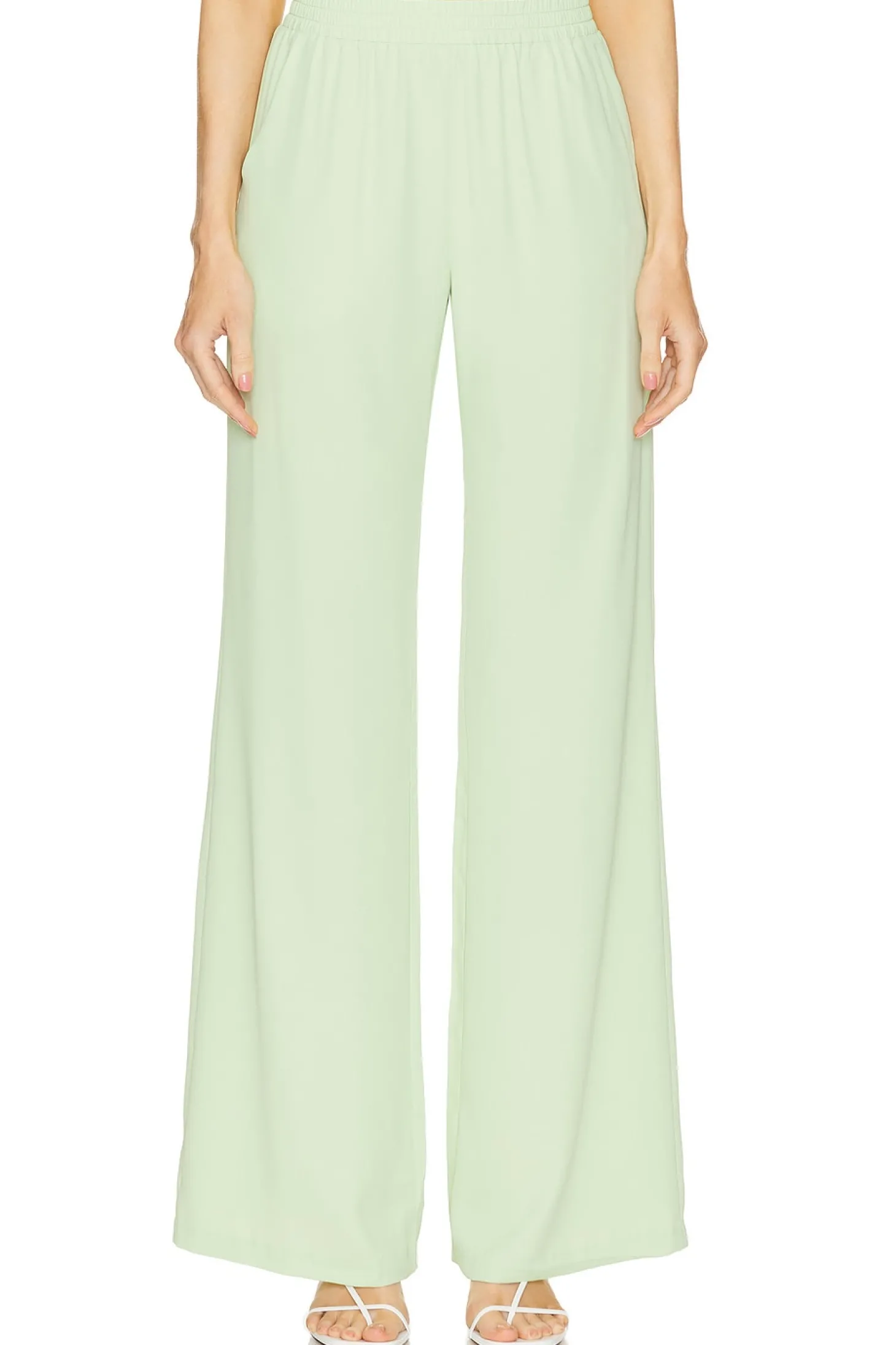 100% polyester.Made in China.Machine wash.Pull-on styling.Side slant pockets.Chiffon fabric.Item not sold as set.22" at the knee breaks to 25" at the leg opening