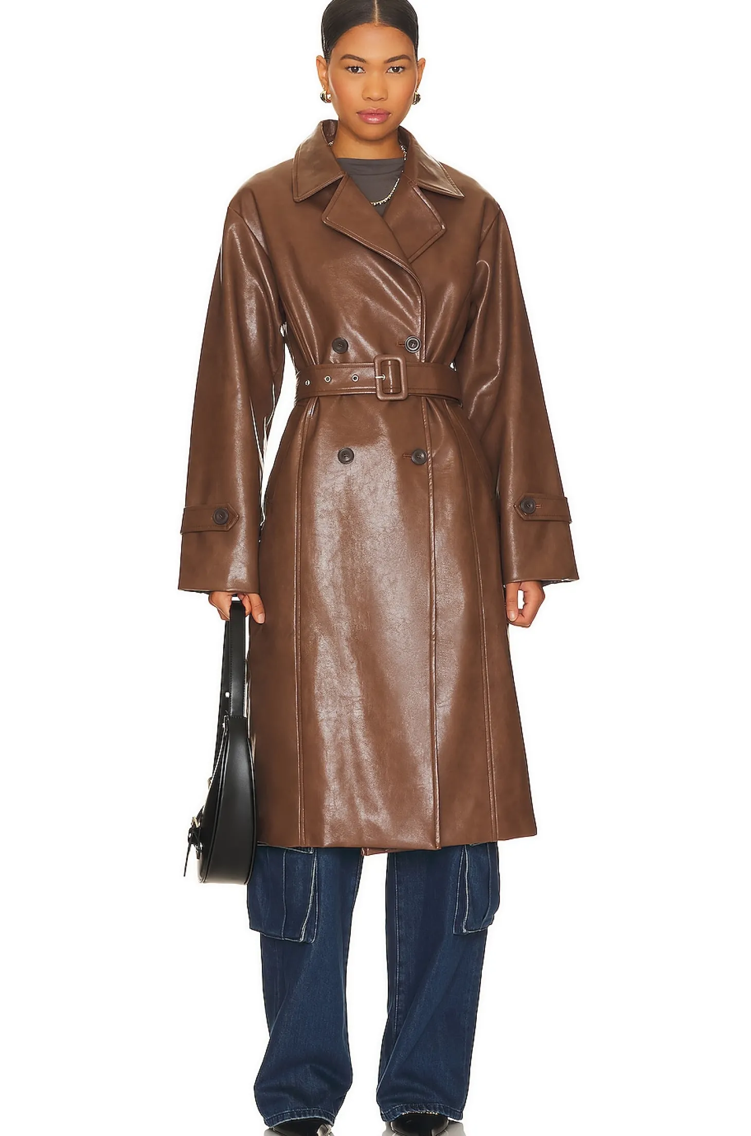 60% polyurethane 40% cotton.Made in China.Dry clean only.Double breasted front button closure.Side slip pockets.Removable waist belt.Adjustable tabs at cuffs
