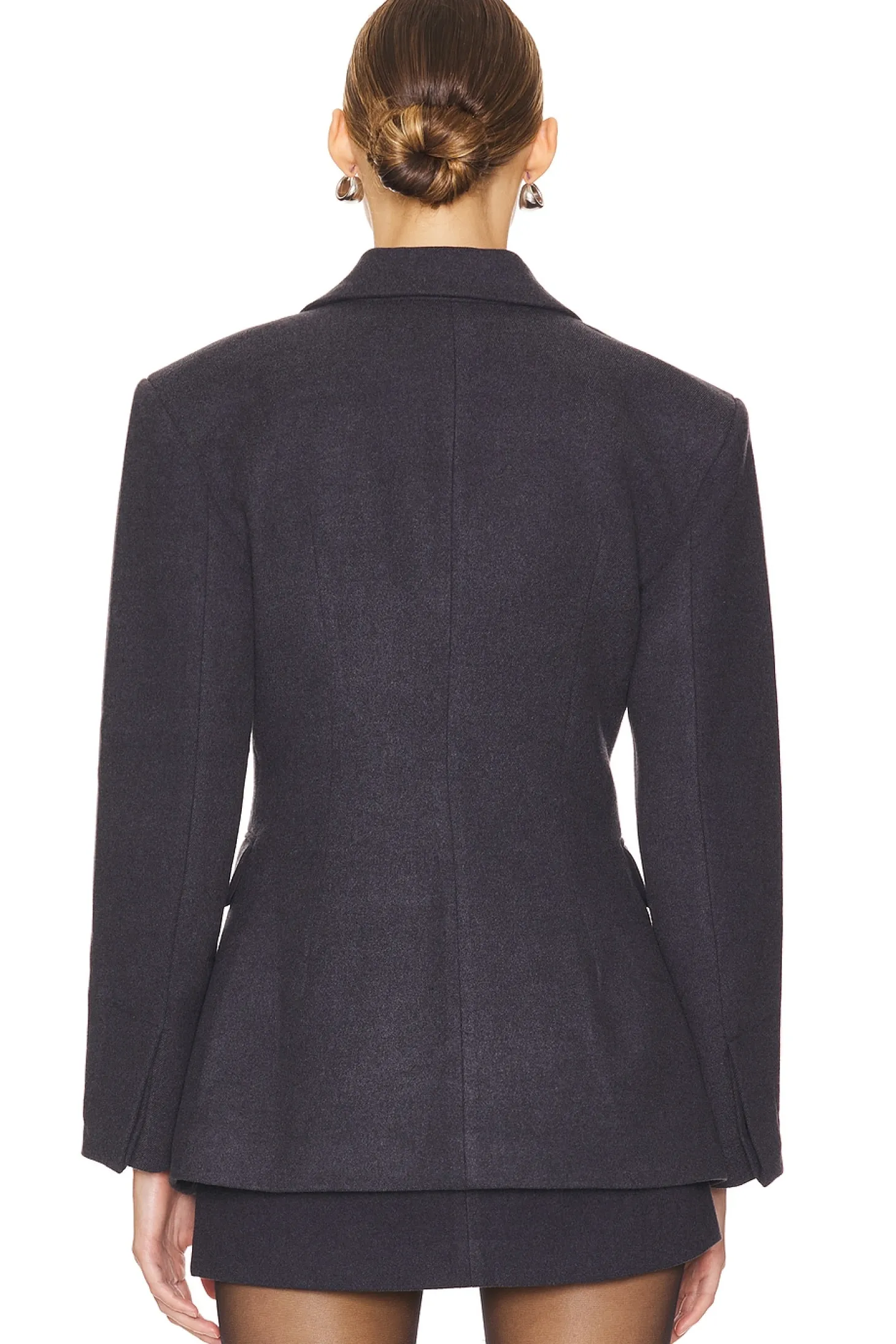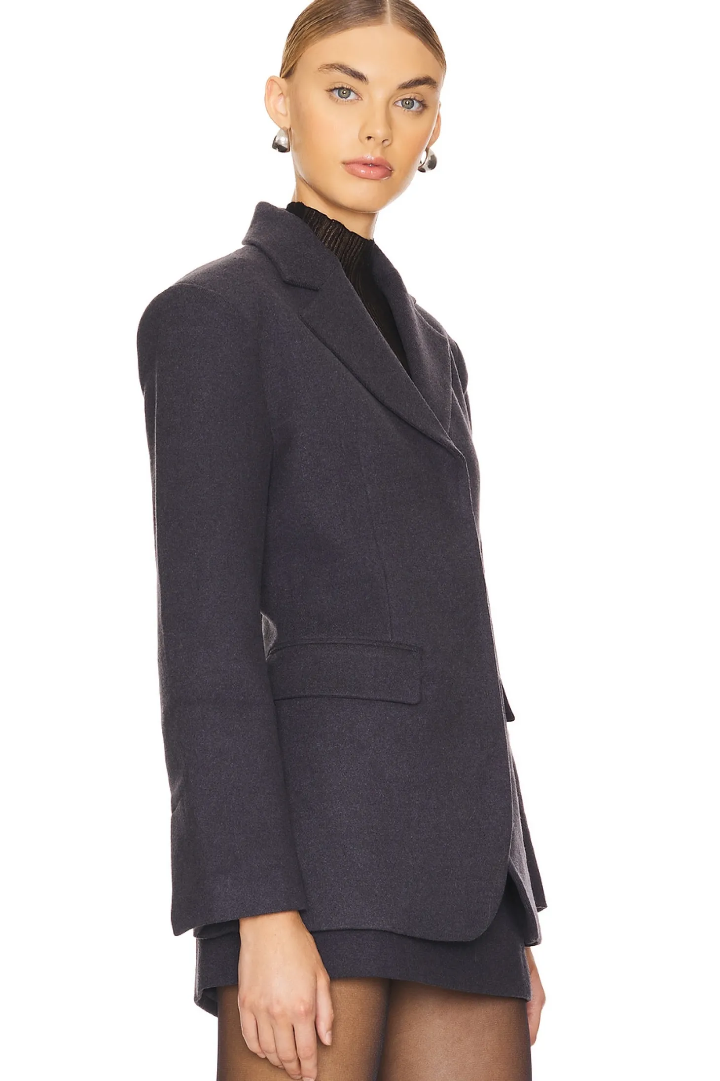 68% polyester 28% rayon 4% spandex.Made in China.Dry clean.Front button closure.Padded shoulders.Side flap pockets.Button cuffs.Melton fabric