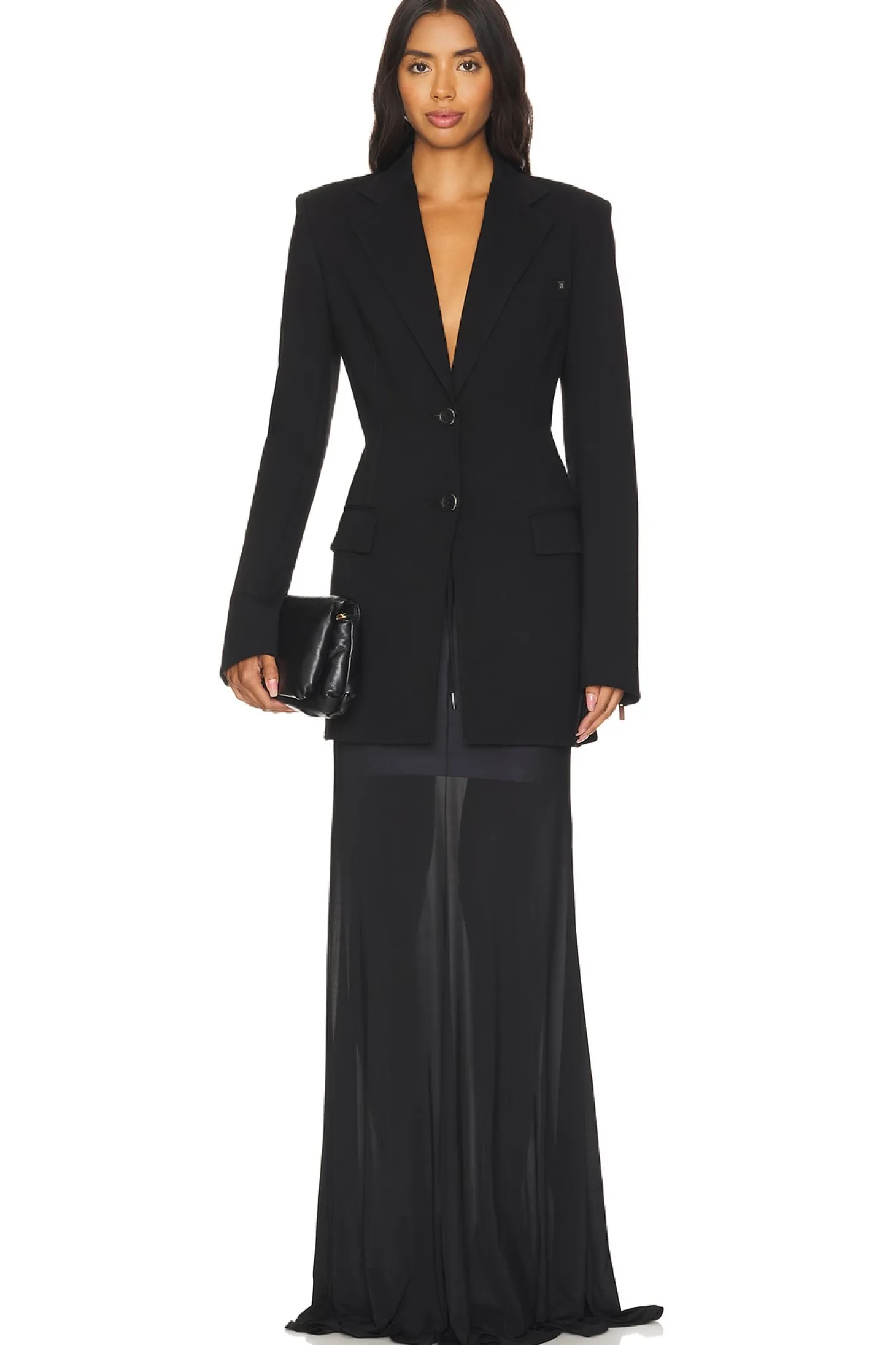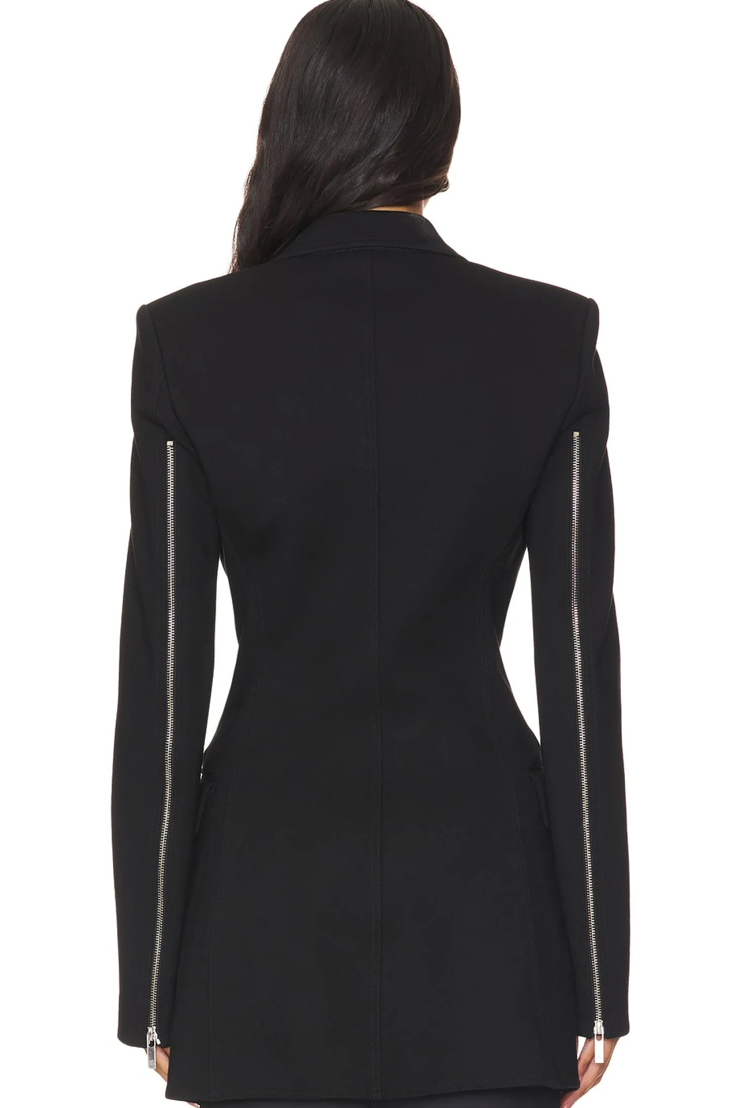 Shell: 75% rayon 20% nylon 5% spandex Lining: 94% polyester 6% spandex Pocketing: 100% viscose Undercollar: 100% polyester.Made in China.Dry clean recommended.Front button closure.3-pocket design.Padded shoulders.Zipper cuffs.Heavyweight fabric