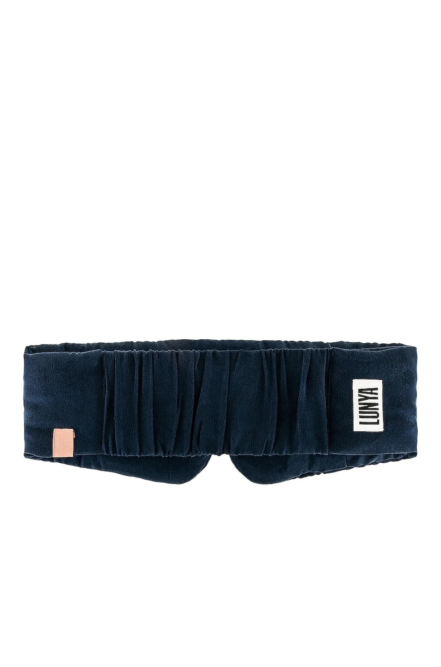 Self: 100% silk Padding: 100% polyester.Made in China.Hand wash.Cushioned mask with smocked elastic back