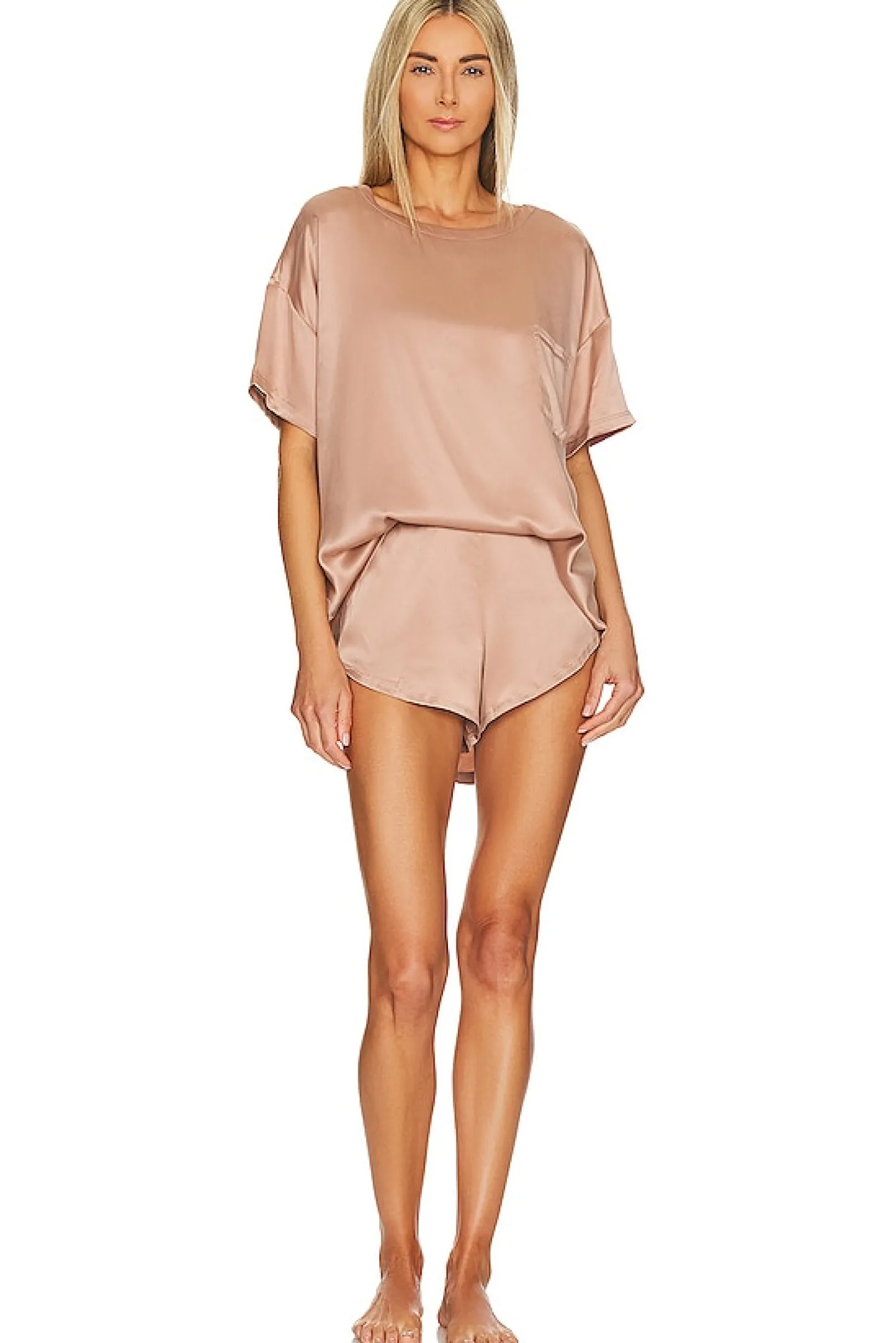 100% silk.Made in China.Hand wash.Sold as a set.Boxy top with breast pocket.High-cut shorts with elastic waist.Buttery satin fabric
