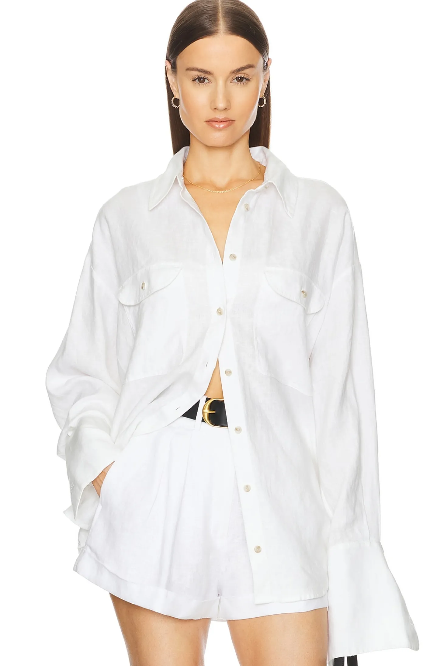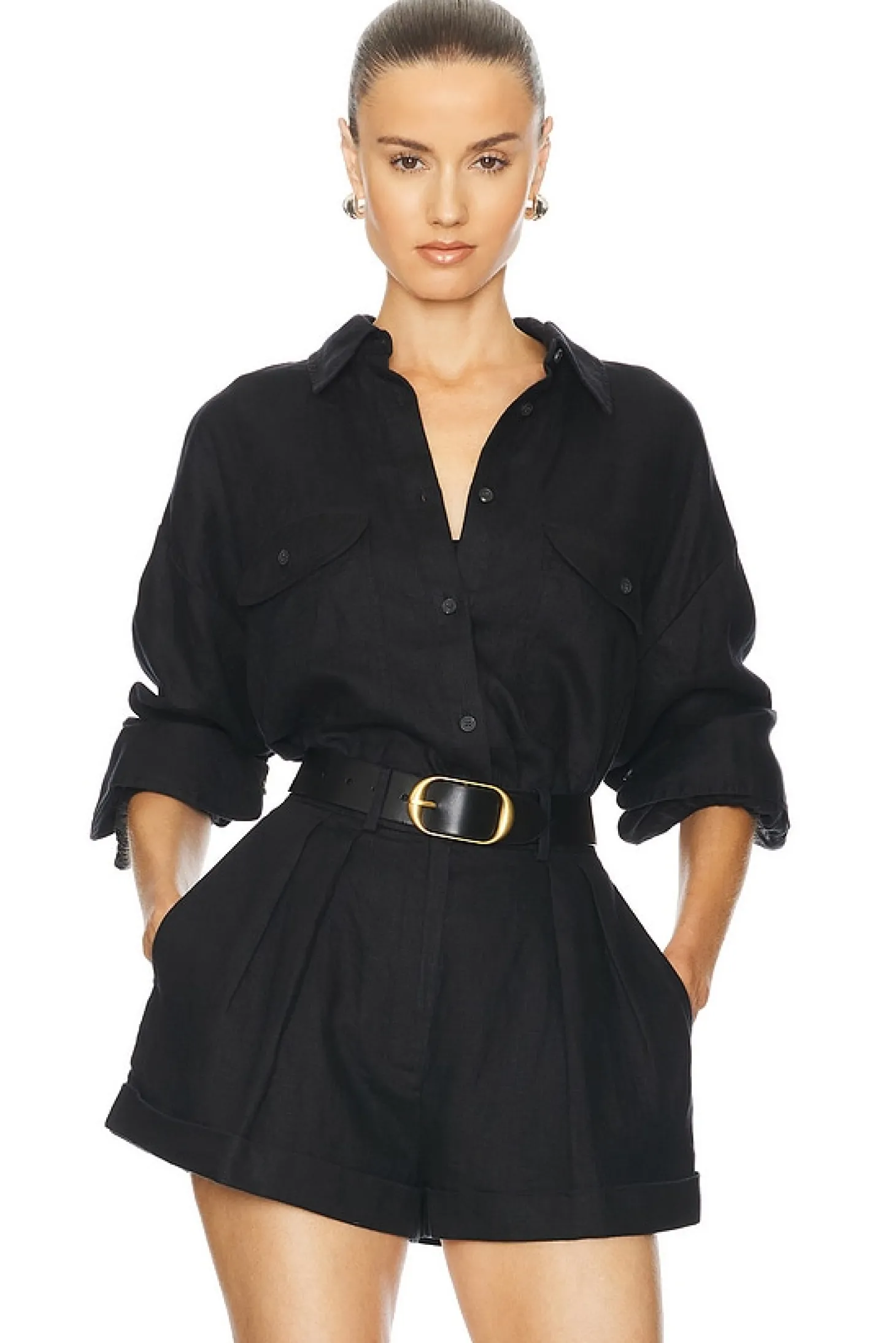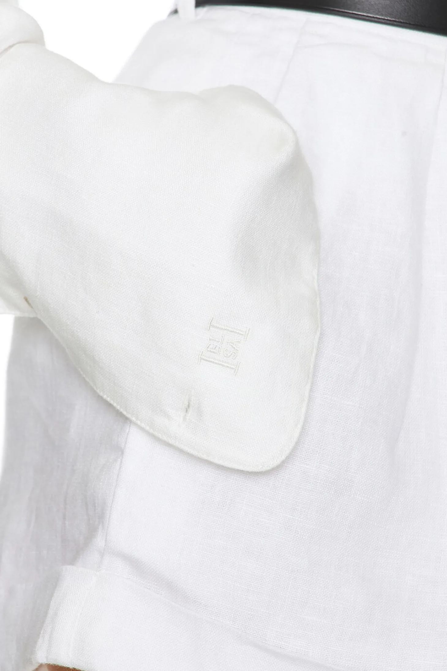 100% linen.Made in China.Hand wash.Front button closure.Buttoned cuff.Breast flap pockets.Item not sold as a set