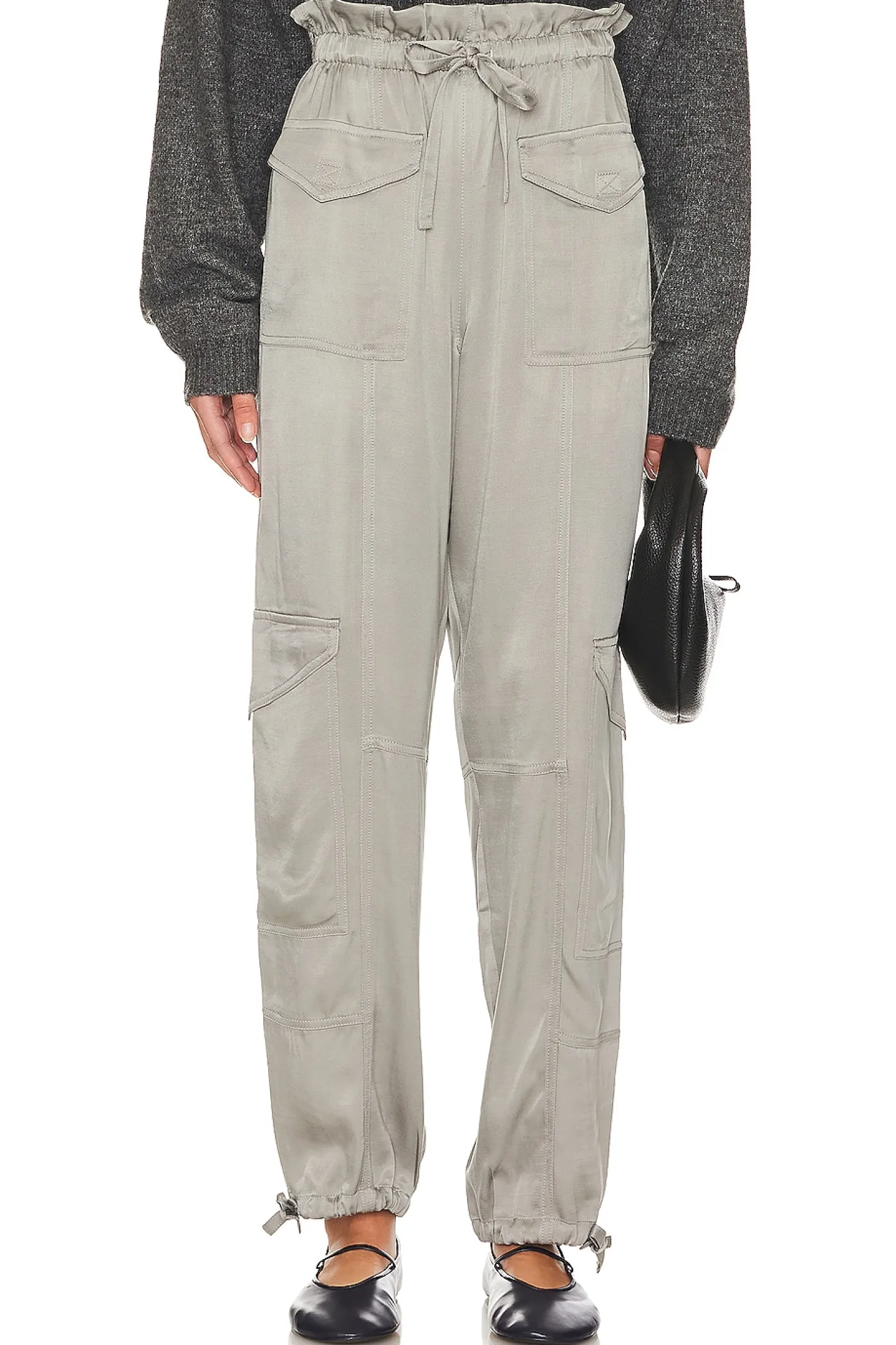50% ECOVERO viscose 50% cupro.Made in China.Machine wash.Drawstring paperbag waist tie closure.6-pocket styling includes two cargo button pockets.Satin fabric with paperbag waist.22" at the knee narrows to 14" at the leg opening