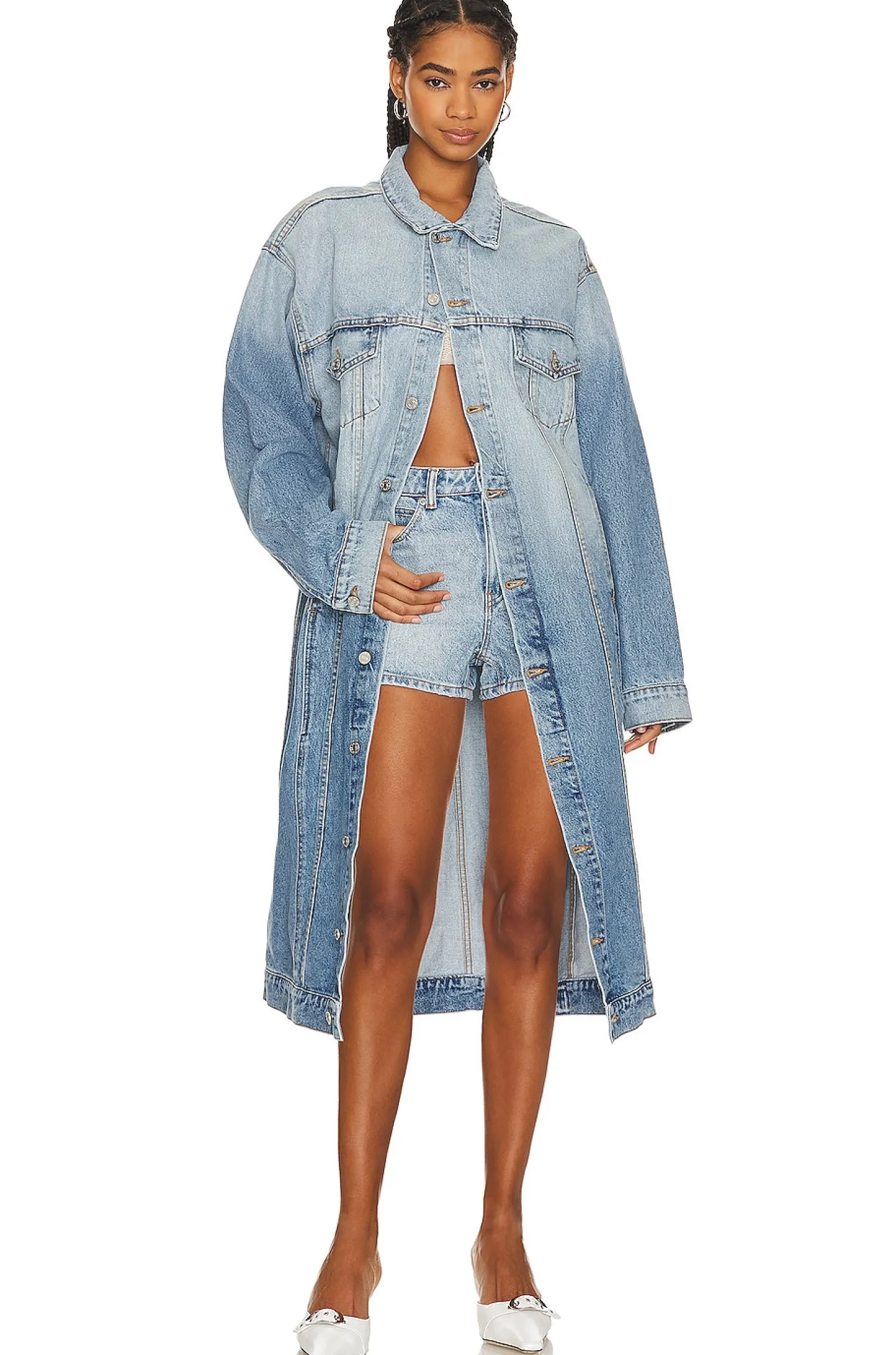 Self: 100% cotton Lining: 65% polyester 35% cotton.Made in USA.Dry clean only.Front button closure.4-pocket styling.Buttoned cuffs.Back vent