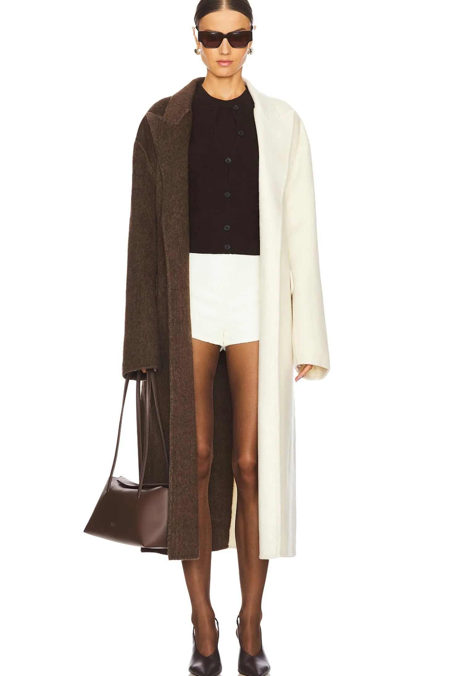 Self: 100% wool Combo: 68% wool 27% polyester 5% tencel.Made in China.Dry clean.Color block design.Open front.Dual pockets at front