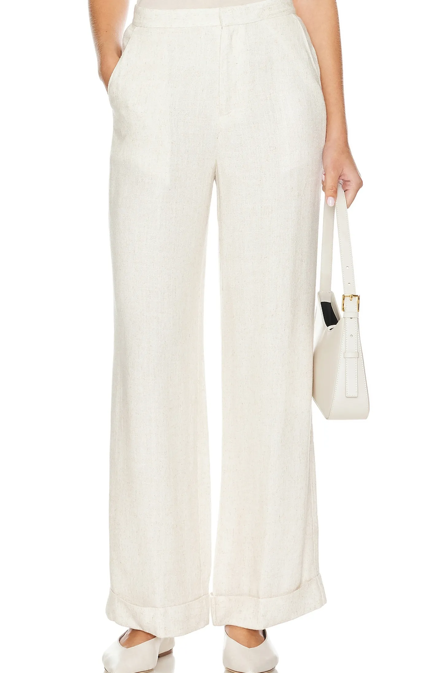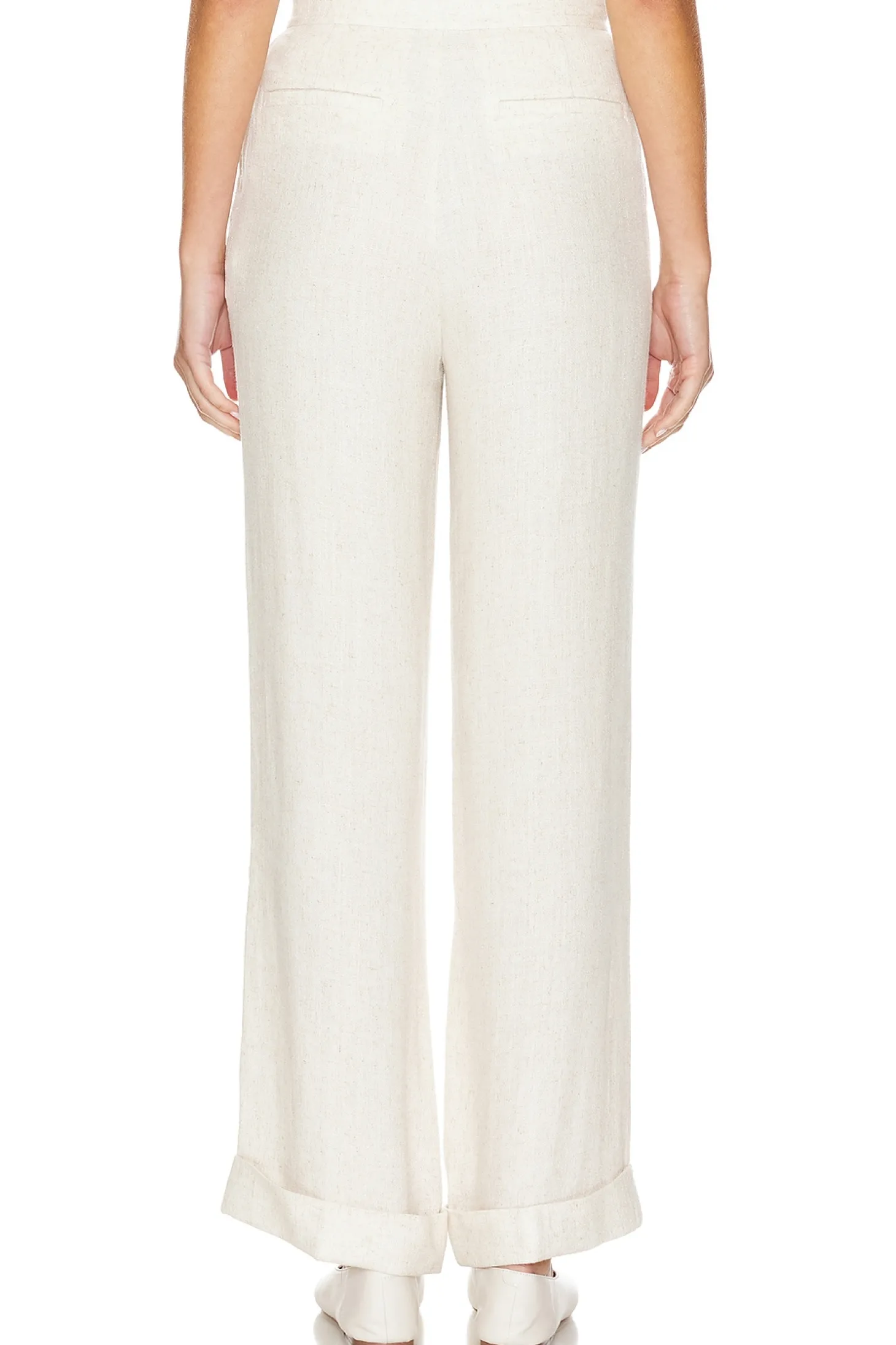 Self: 30% linen 70% polyester Contrast: 100% polyester.Made in China.Dry clean only.Zip fly with hook and bar closure.4-pocket styling.Lightweight linen fabric.20" at the knee and 20" at the leg opening