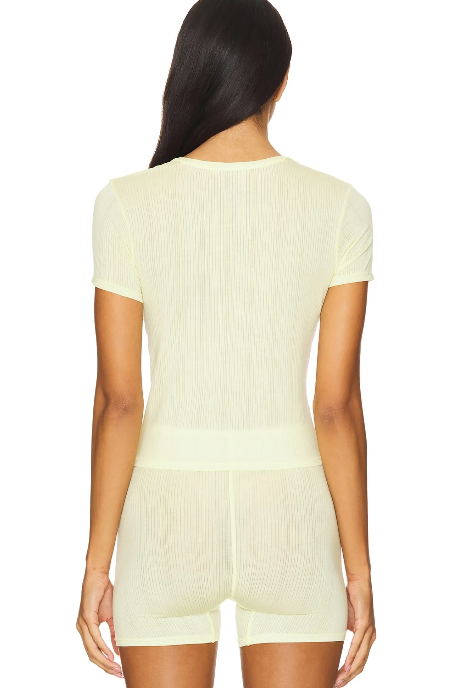 91% micromodal 9% lycra.Made in China.Machine wash.Pull-on styling.Crewneck at front and back Cropped hem hits around the belly button.Lightweight jersey fabric.Wispy soft stretch fabric Drop-needle stitch creates a subtle, vertical stripe effect.Item not sold as a set