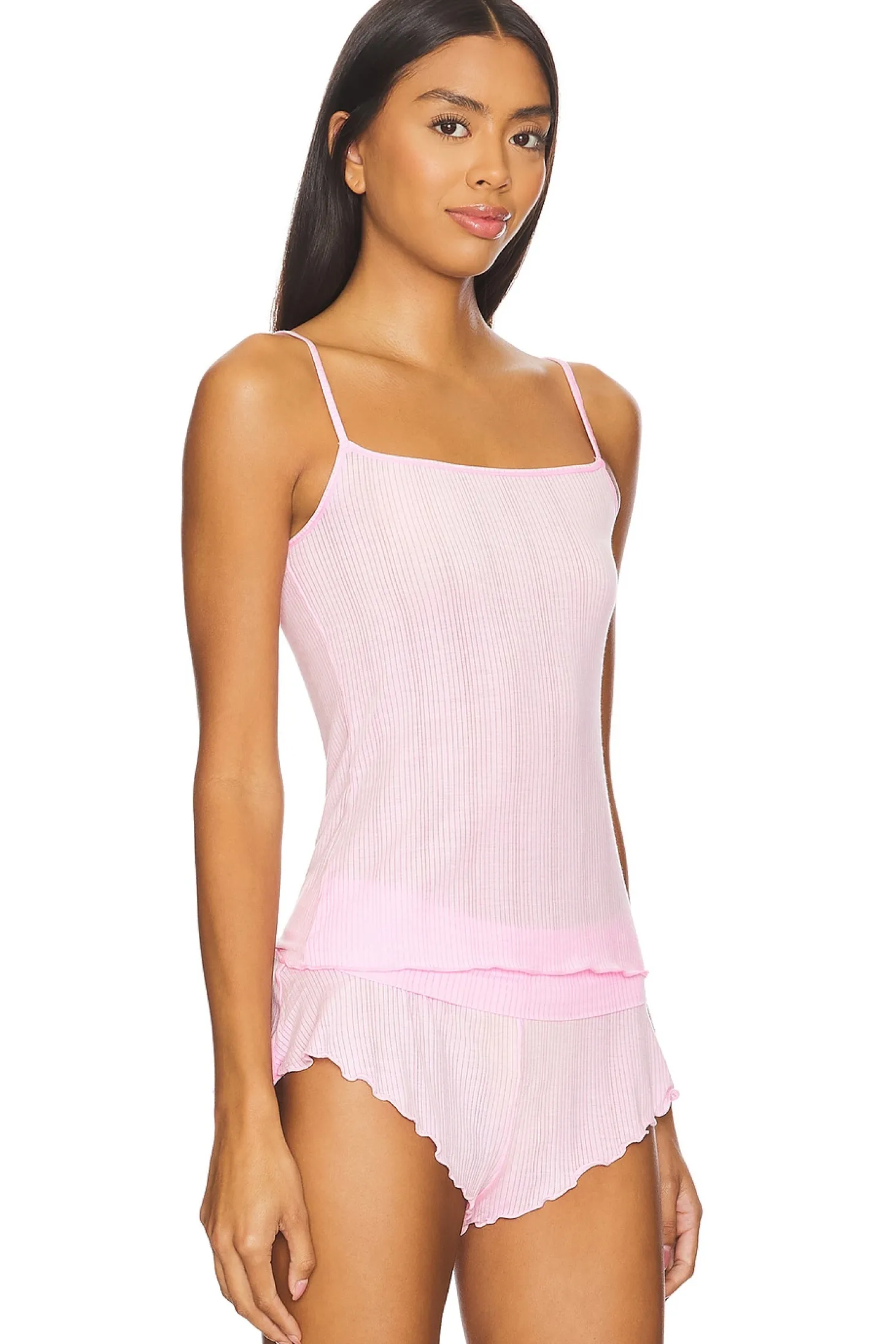 91% micromodal 9% lycra.Made in China.Machine wash.Adjustable shoulder straps.Lightweight ribbed jersey fabric with lettuce hem.Wispy soft stretch fabric.Drop-needle stitch creates a subtle, vertical stripe effect.Item not sold as a set