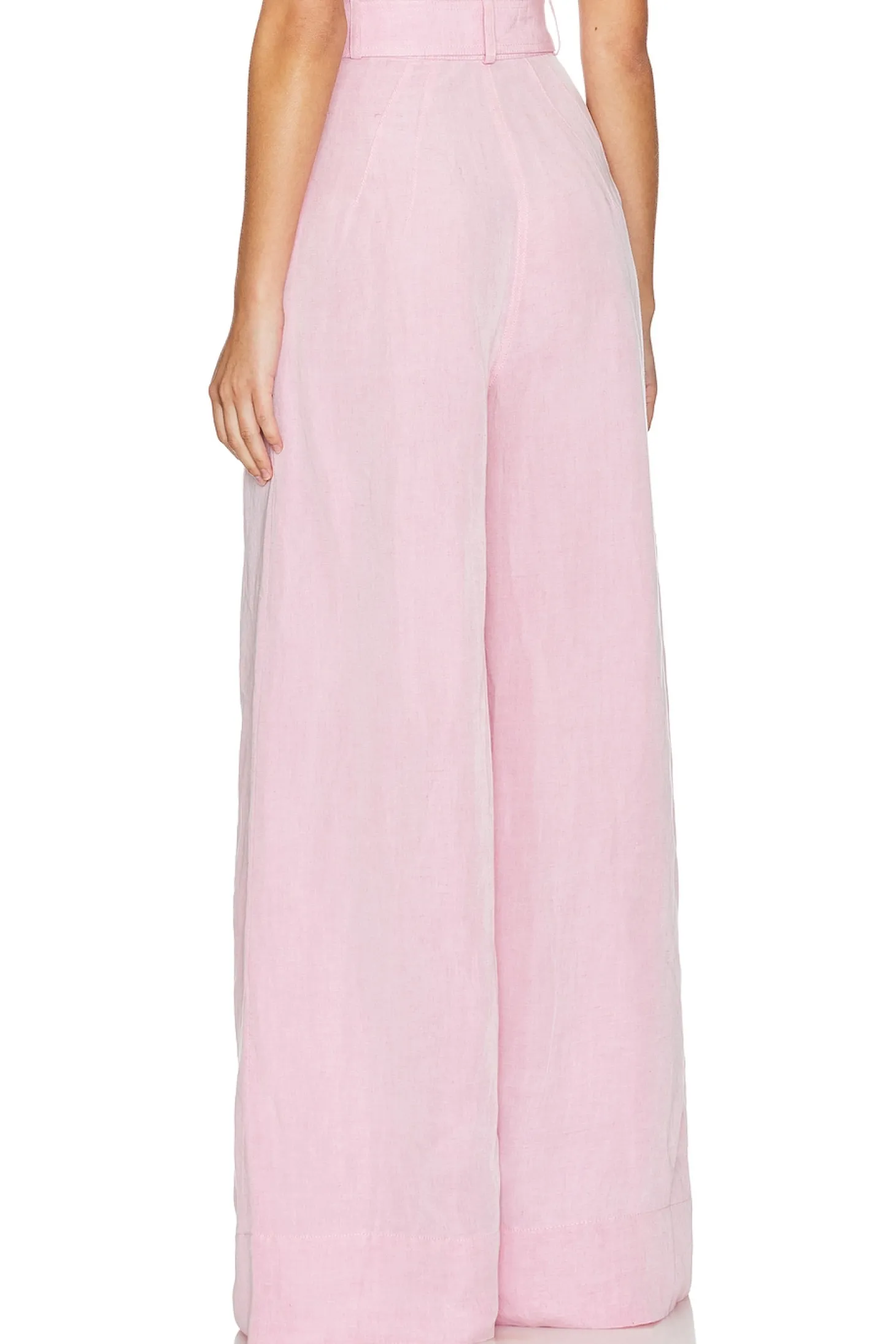 50% viscose 50% linen.Made in USA.Dry clean only.Zip fly with dual hook and bar closure.Side seam pockets.Detachable belt with acetate buckle closure.27" at the knee breaks to 29" at the leg opening