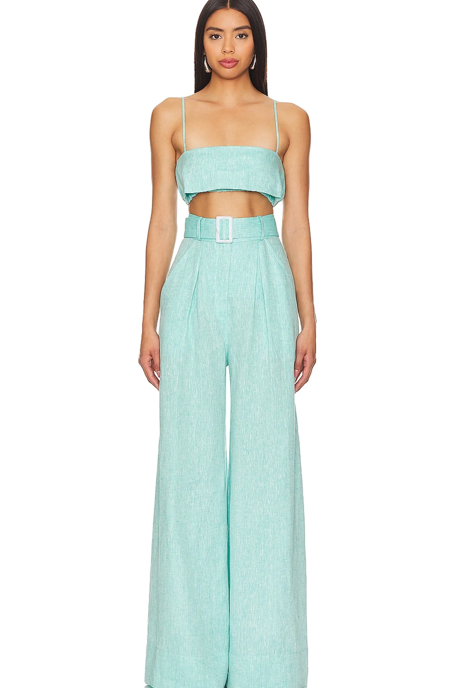 100% linen.Made in USA.Dry clean.Zip fly with dual hook and bar closure.Side seam pockets.Detachable waist belt with acetate buckle closure.Linen fabric with front pintuck detailing Item not sold as a set.29" at the knee breaks to 30.5" at the leg opening