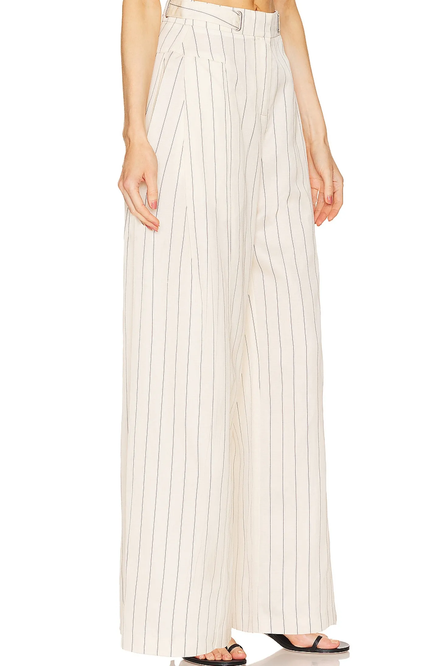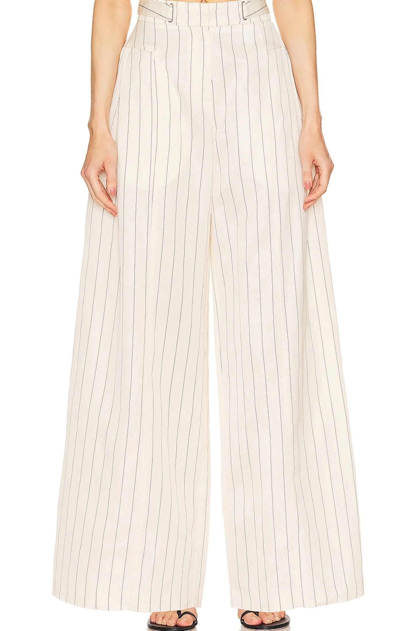 74% viscose 26% linen.Made in China.Dry clean only.Zip fly with button closure.Side seam pockets.Front pintuck detail.Item not sold as a set.32" at the knee and 32" at the leg opening
