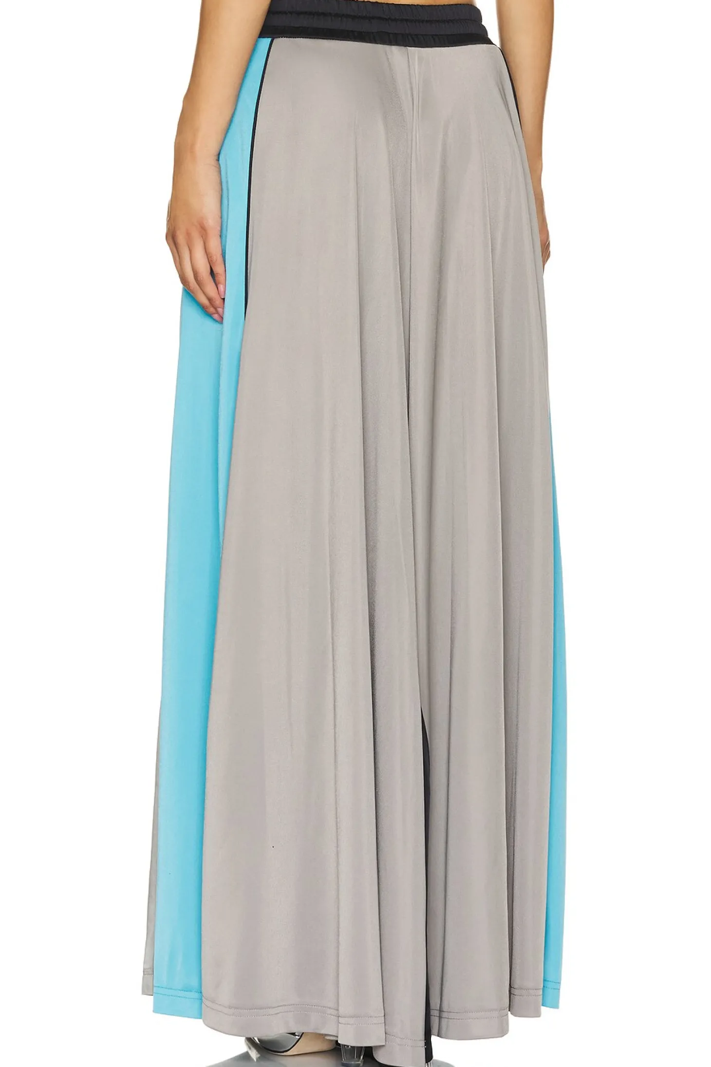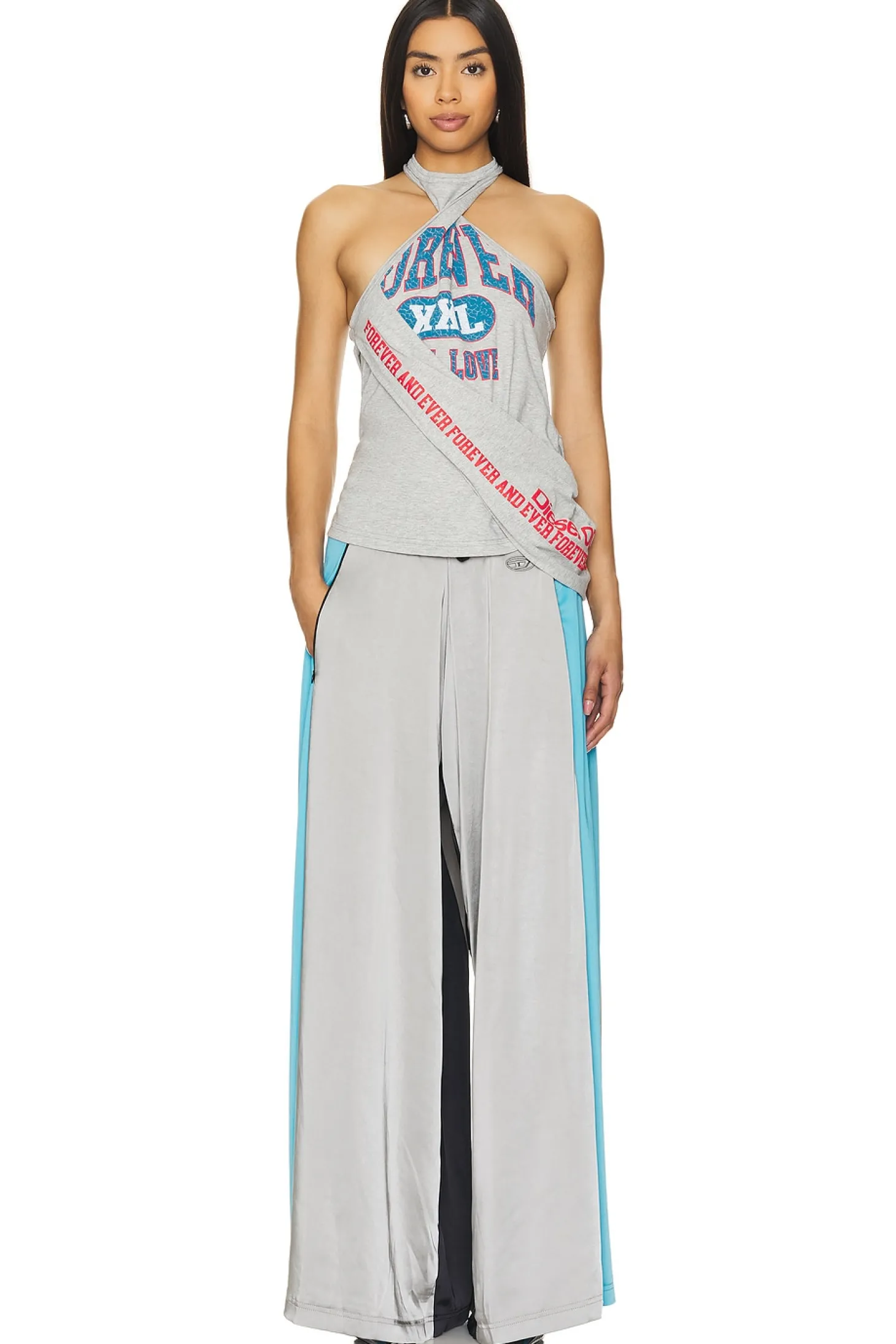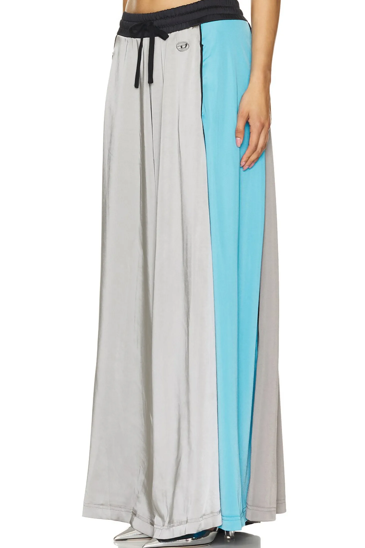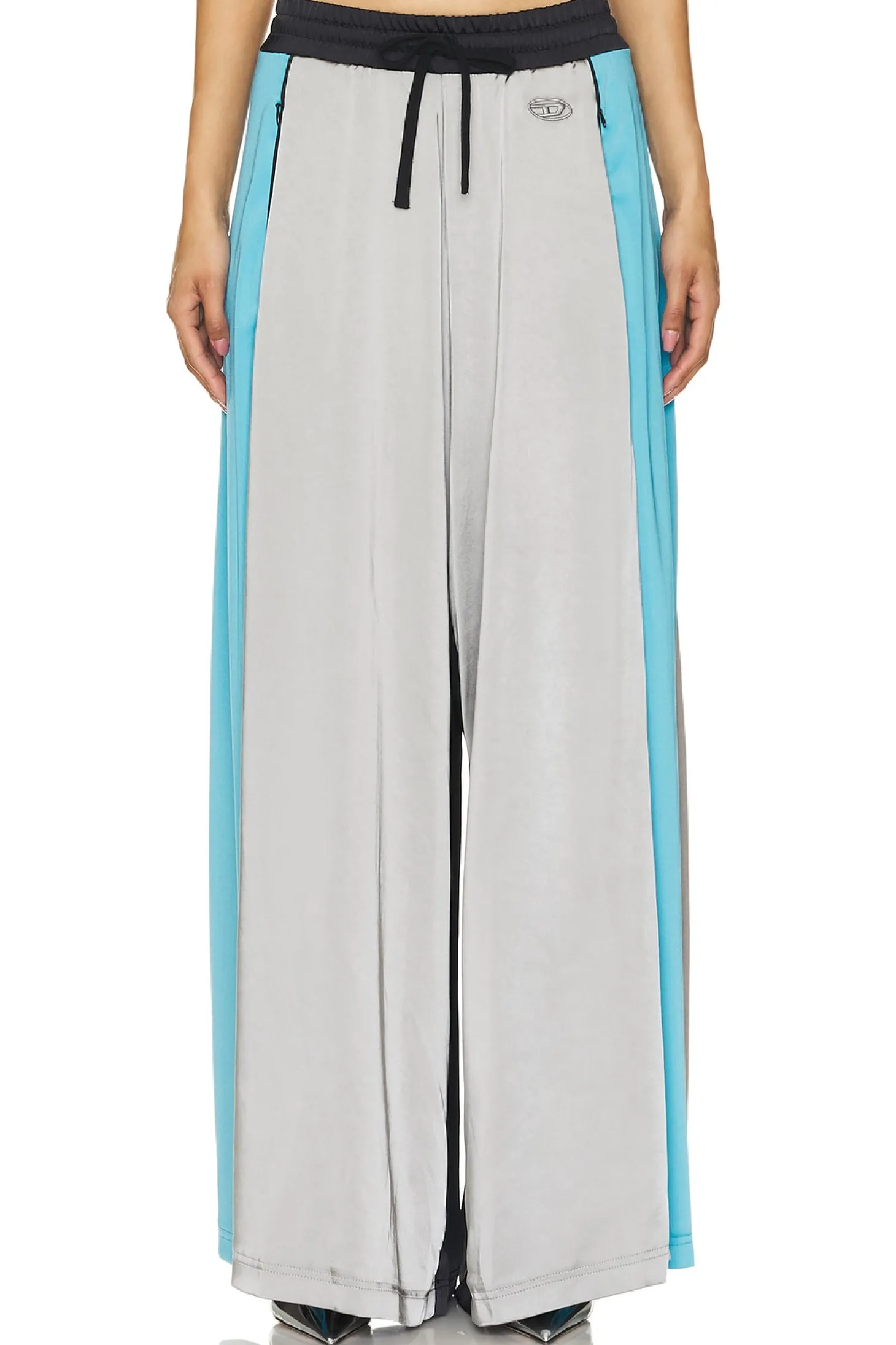 100% polyester.Made in China.Hand wash.Drawstring closure.Zipper side slant pocket styling.43" at the knee breaks to 69" at the leg opening