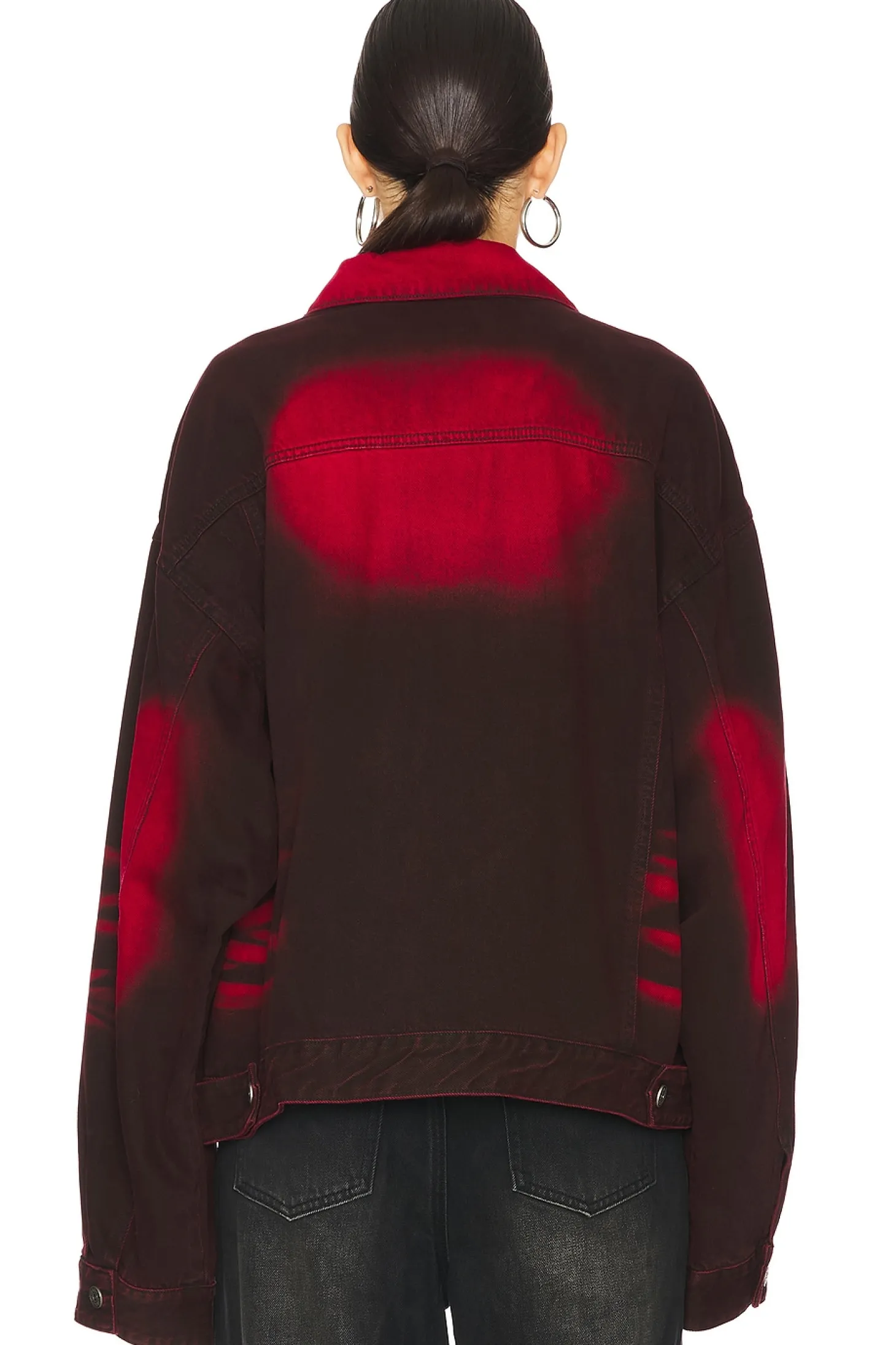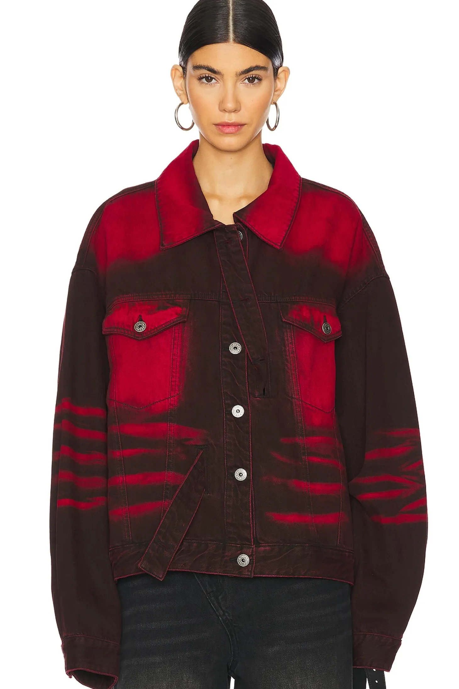 100% cotton.Made in China.Machine wash.Front button closure.Front slant welt pockets and breast button pockets Denim belt detail.Heavyweight denim fabric with intentional bleaching throughout