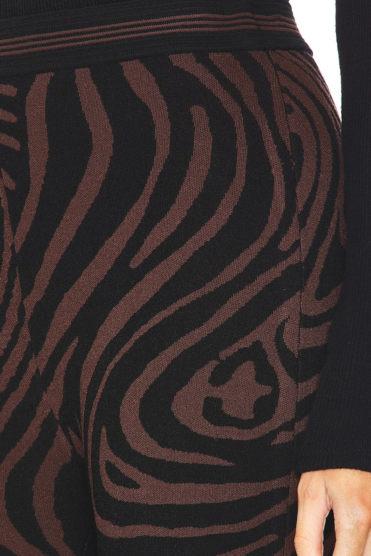 79% viscose 21% polyester.Made in China.Dry clean only.Pull-on styling with elastic waistband.Midweight fabric.14" at the knee breaks to 20" at the leg opening
