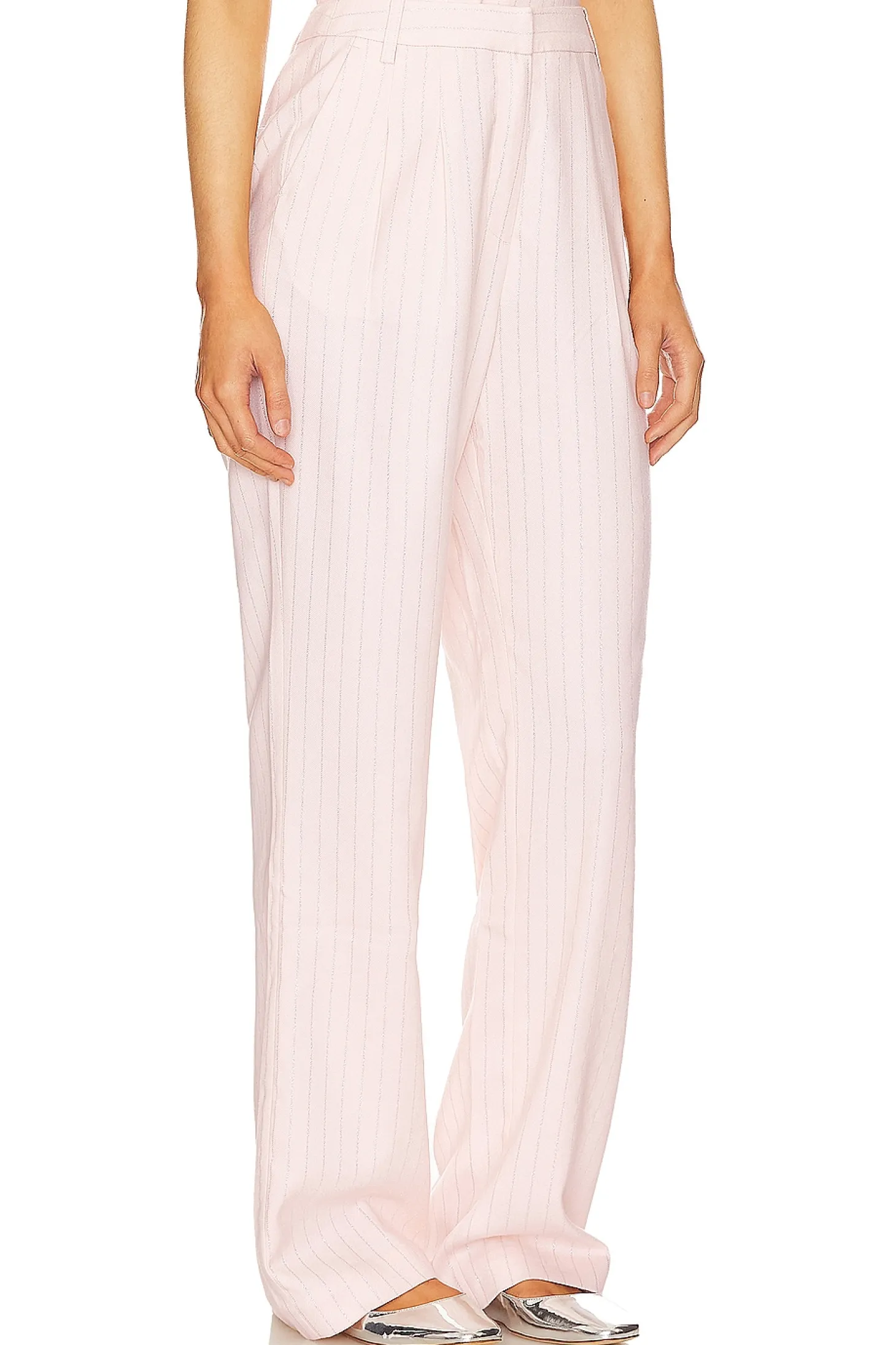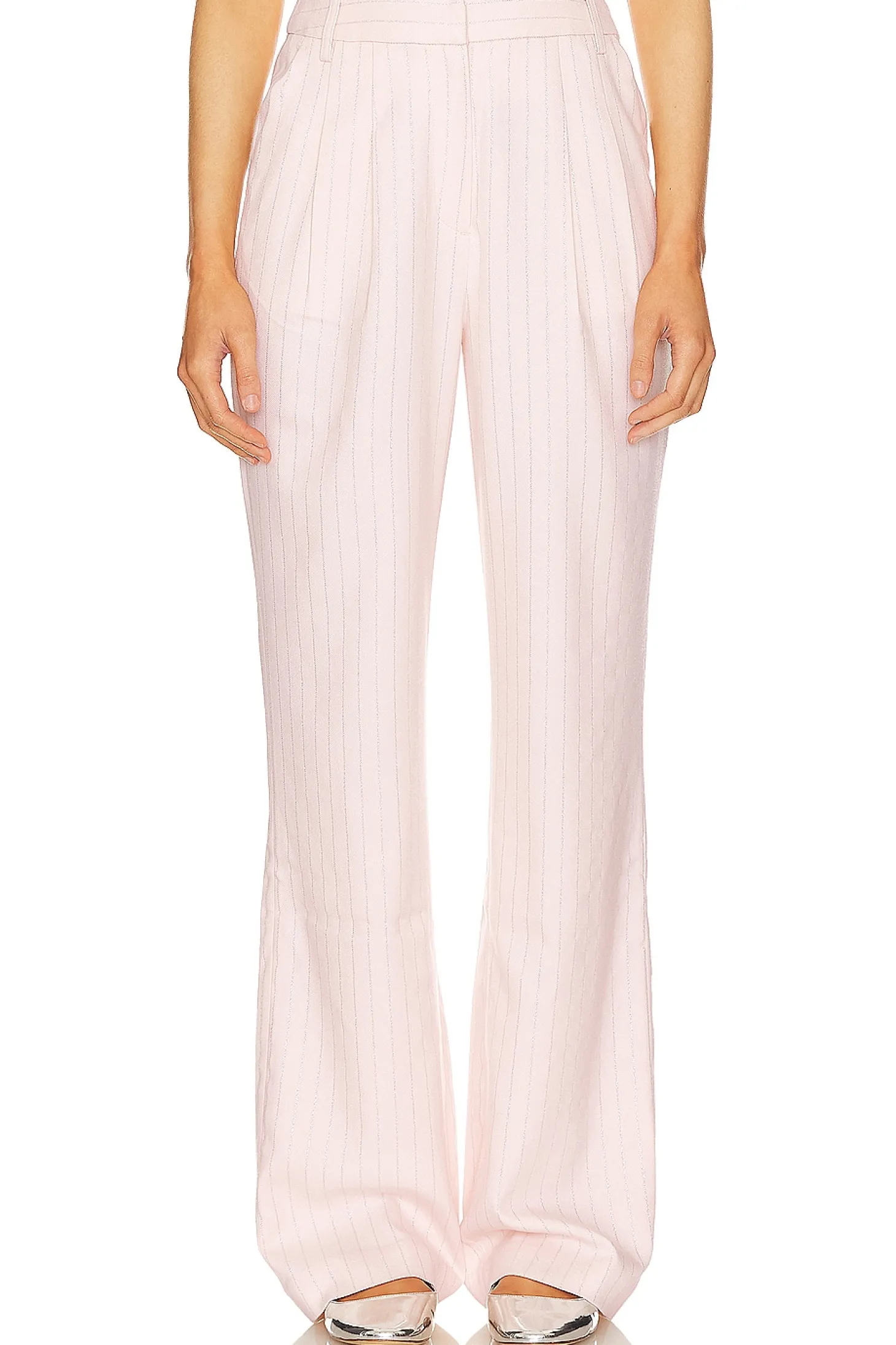Choose the smartest pick for your next night out skirt, the Lovers and Friends x Anja Dujakovic Jasmine Pant in Pink Pinstripe. This suiting-inspired stunner, crafted from twill fabric with metallic threading, flaunts a chic tailored silhouette. Elevate your style game with academic sophistication..Self: 65% polyester 32% rayon 2% spandex 1% metallic fibers Lining: 100% polyester.Made in China.Dry clean only.Zip fly with hook and bar closure.4-pocket styling.Twill fabric with metallic threading.20" at the knee and 20" at the leg opening