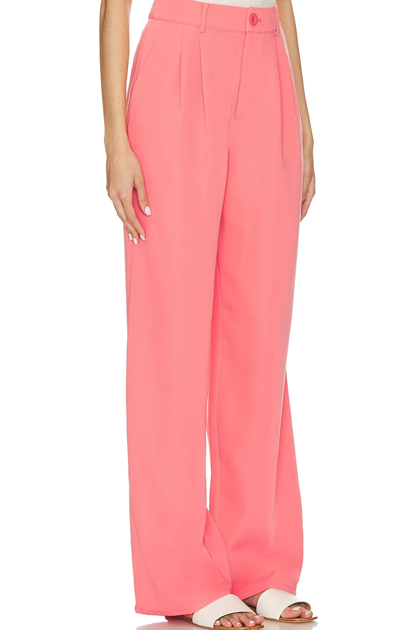 100% polyester.Made in China.Dry clean only.Zip fly with button closure.Side slant and back welt pockets.Pleated crepe fabric.Item not sold as a set.22" at the knee narrows to 18" at the leg opening