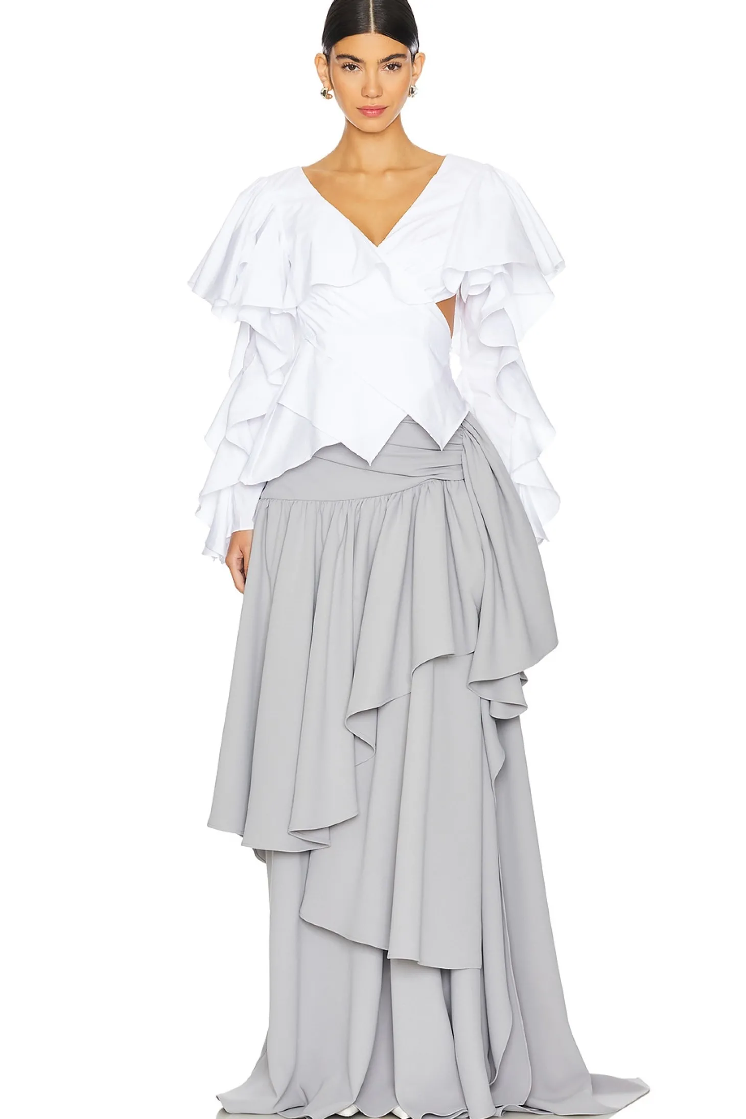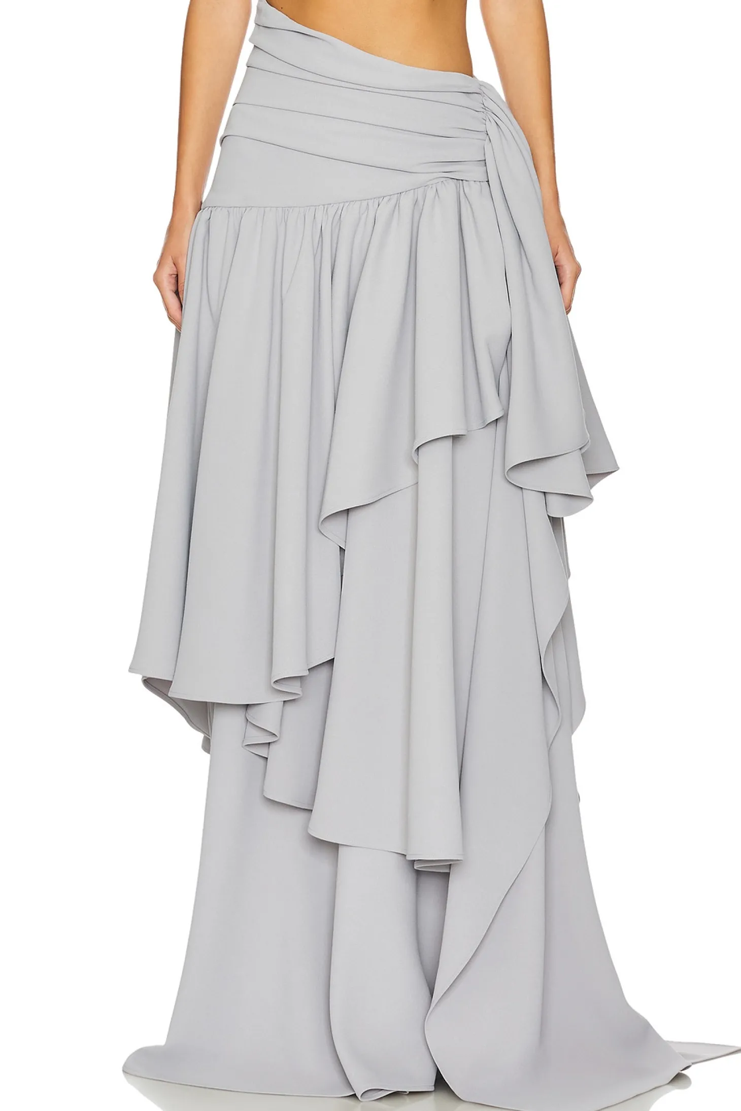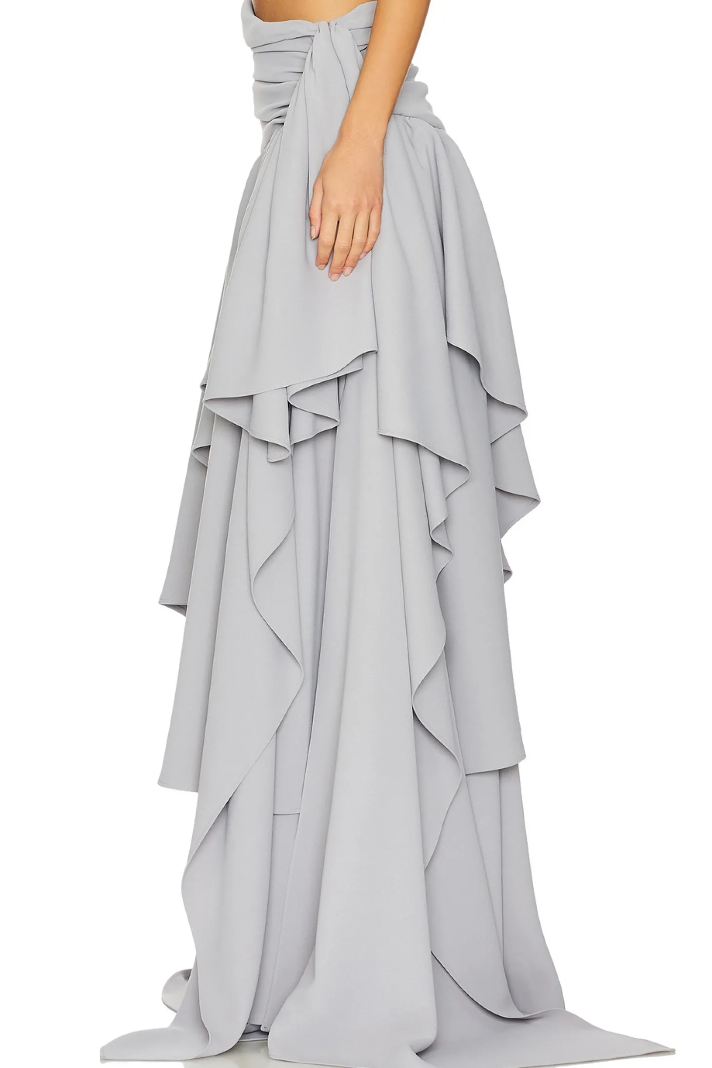 95% polyester 5% elastane.Made in USA.Dry clean only.Fully lined.Hidden side zip closure.Boned waistline.Heavyweight multi-tiered crepe fabric.Waist to shortest hem measures approx 48" and to longest hem approx 58" in length