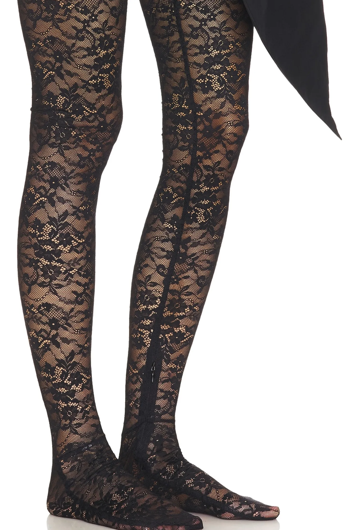 Self 1: 73% nylon 27% spandex Self 2: 100% polyester Self 3: 90% nylon 10% spandex.Made in China.Dry clean only.Hidden back zipper closure.Mockneck design.Lace fabric with ripstop bow accent.Garment is intentionally sheer, undergarments will show through. Please note undergarment not included
