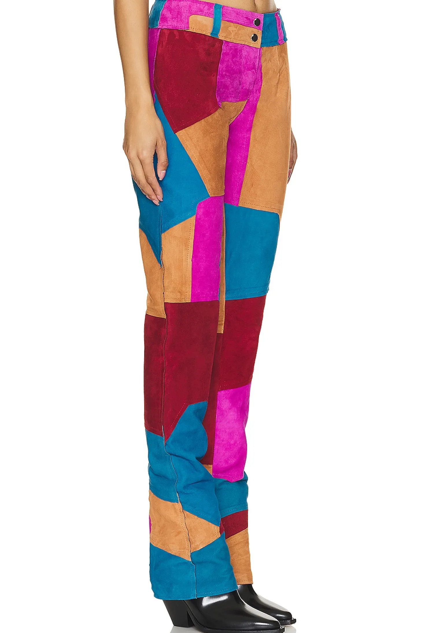 Self: 100% real leather Lining: 100% polyester.Made in Pakistan.Professional leather clean only.Zip fly with button closure.Suede patchwork.15" at the knee breaks to 16" at the leg opening