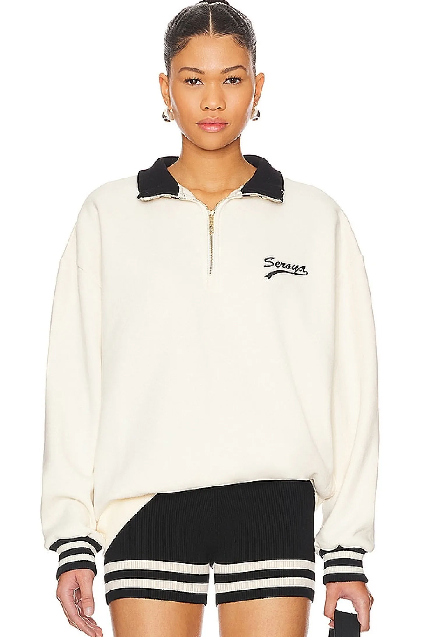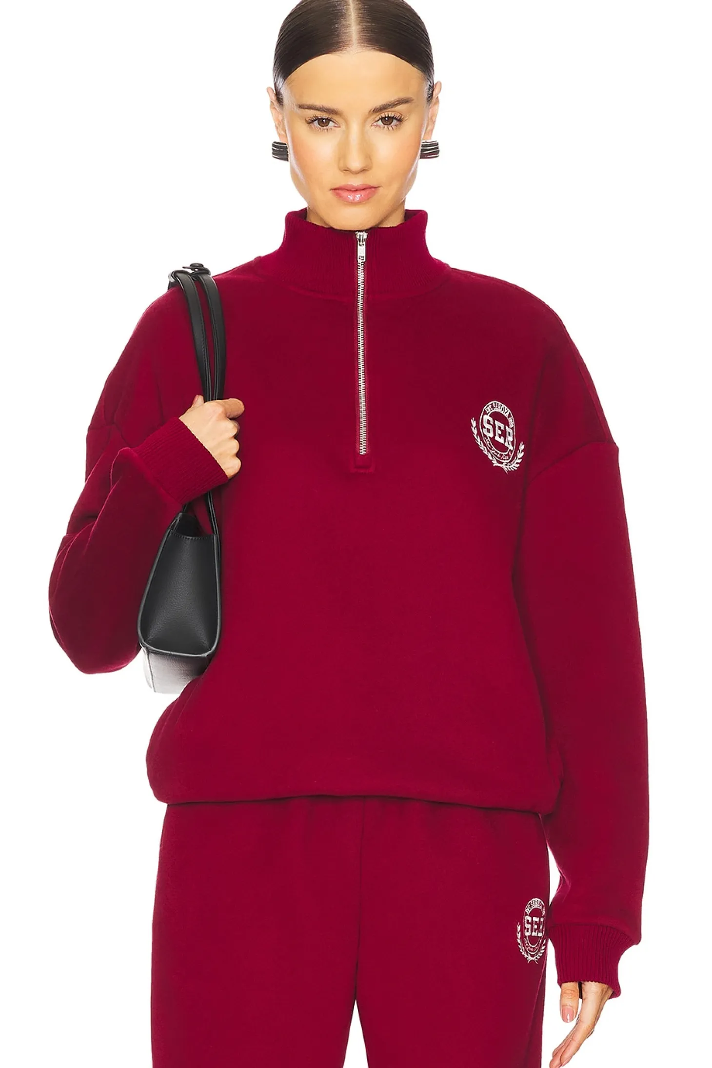 Self: 60% cotton 40% polyester Lining % Contrast Fabric: 100% polyester.Made in China.Machine wash.Pull-on styling with quarter zip.Side seam pockets.Embroidered logo.Fleece lining.Item not sold as set