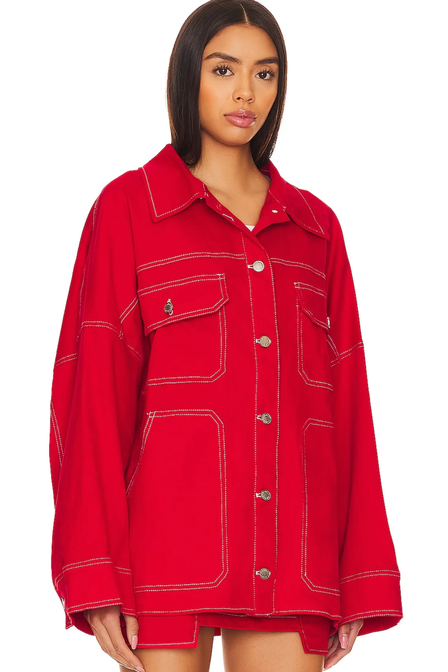 97% cotton 3% elastane.Made in China.Dry clean only.Front button closure.Front patch pockets.Buttoned cuffs.Midweight twill fabric with contrast trim.Item not sold as a set