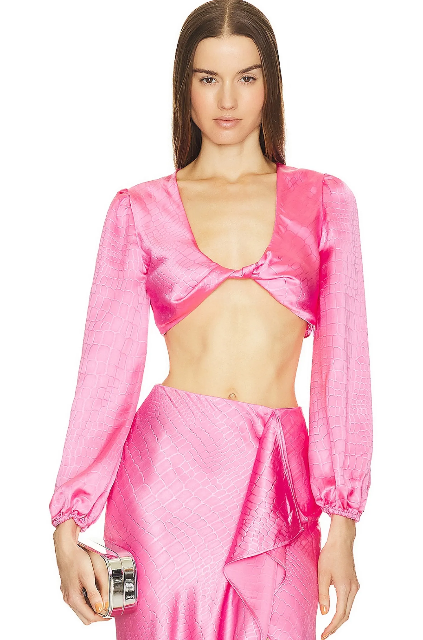 100% recycled polyester.Made in China.Hand wash.Hidden side zipper closure.Front twist detail.Blouson sleeves with elastic cuffs.Lightweight satin fabric