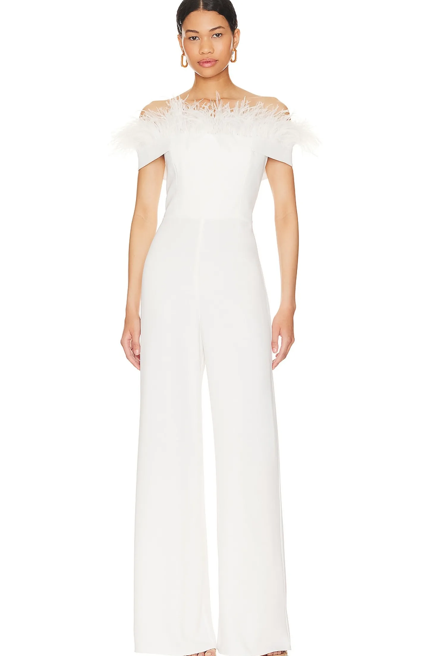 100% polyester.Made in USA.Dry clean only.Hidden back zipper closure.Feather trim.Non-slip silicone grip lining at neckline.Lightweight crepe fabric.Neckline to hem measures approx 56" in length 21" at the knee breaks to 26" at the leg opening