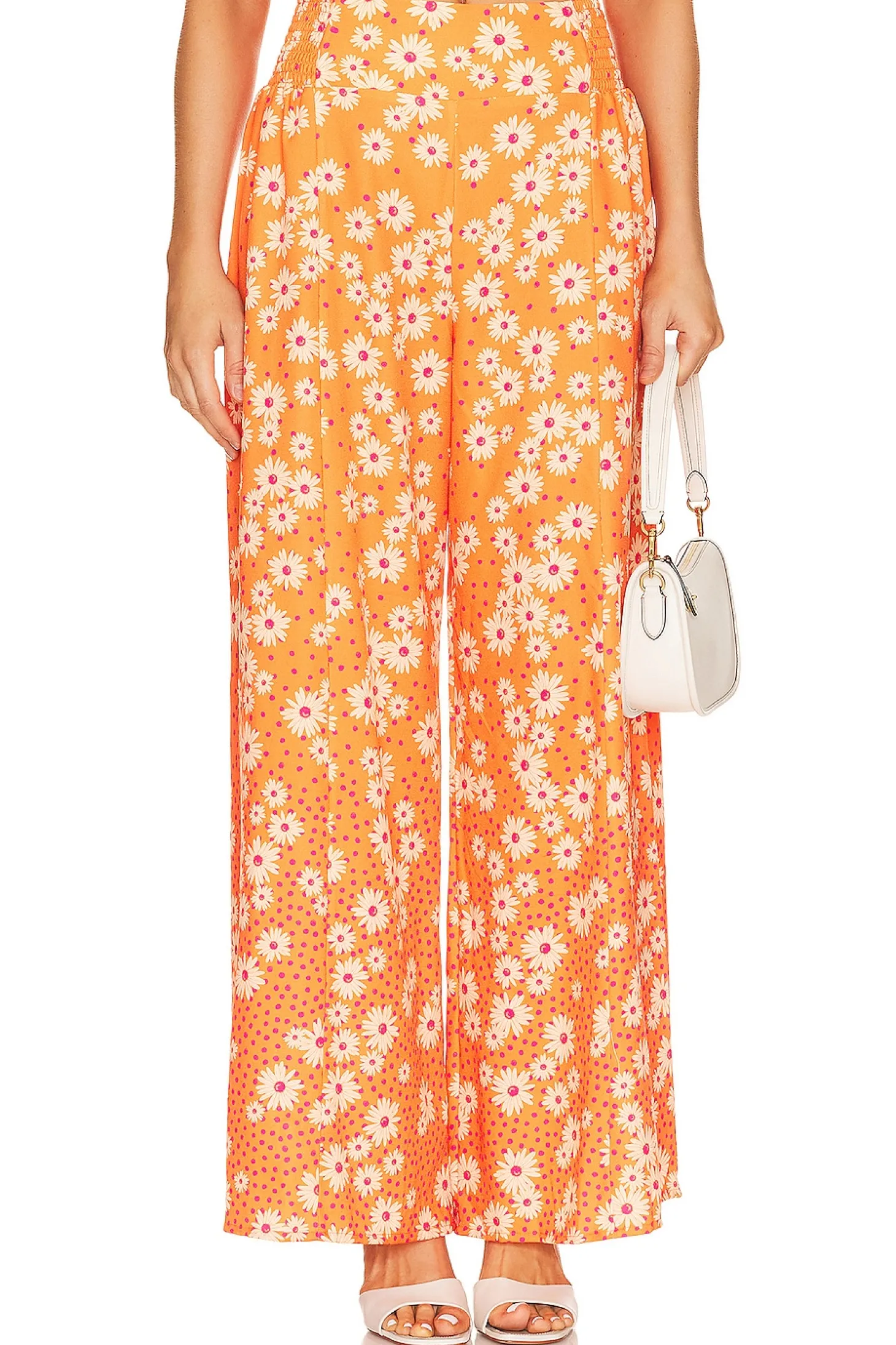 97% polyester 3% spandex.Imported.Hand wash .Smocked side waistband.Flowy lightweight jersey fabric.28" at the knee breaks to 32" at the leg opening