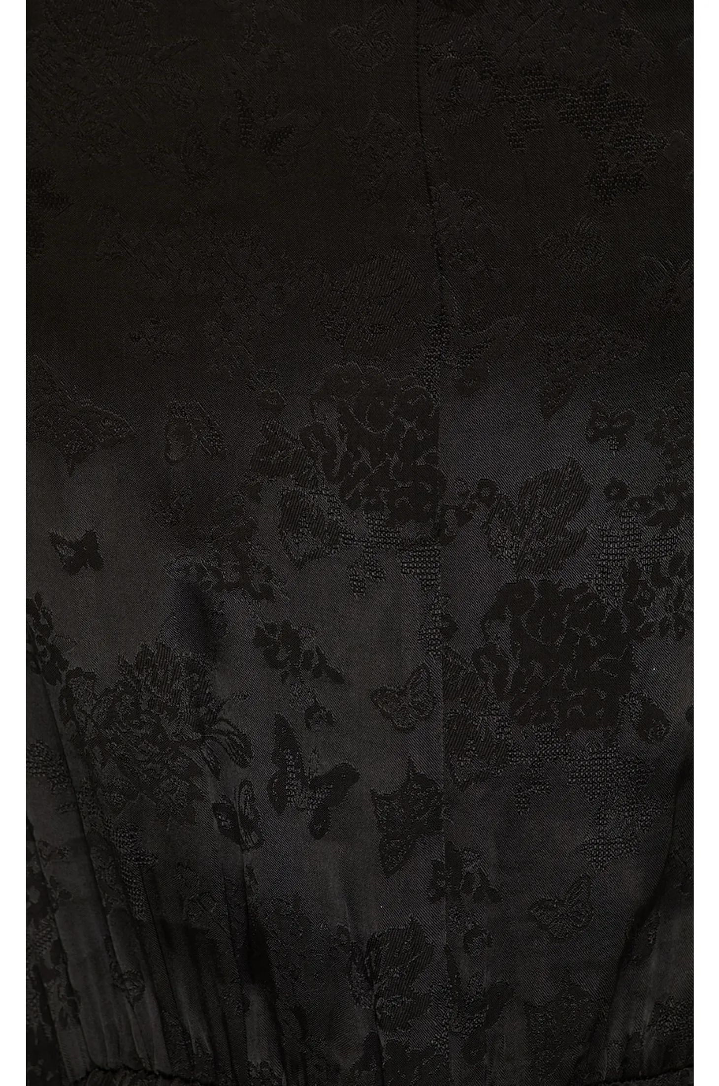 Self: 65% viscose 35% rayon Lining: 100% polyester.Made in China.Hand wash.Pull-on styling with elastic waist.Detachable waist tie closure with beaded fringe trim.Surplice neckline.Side slant pockets Satin jacquard fabric