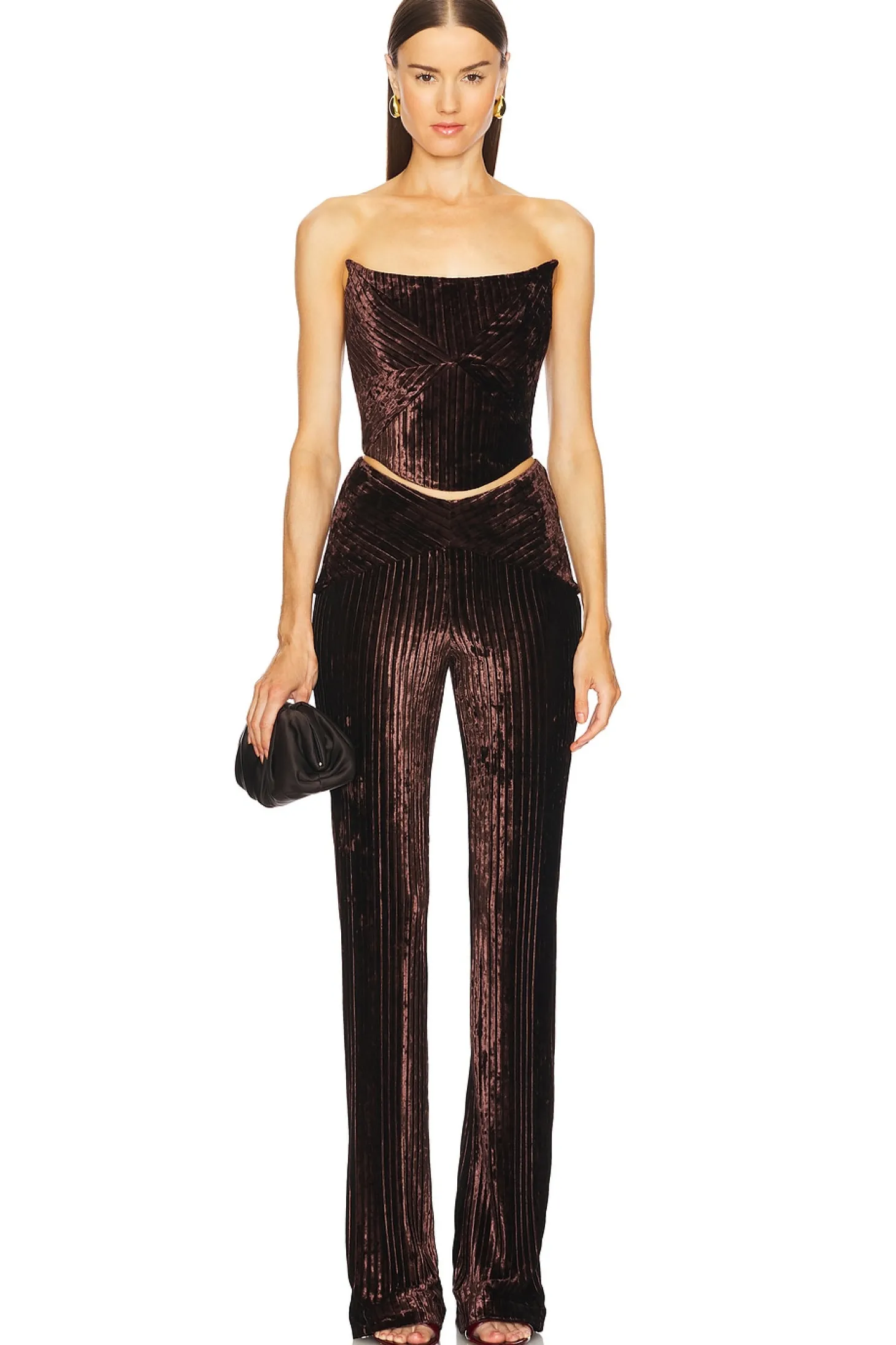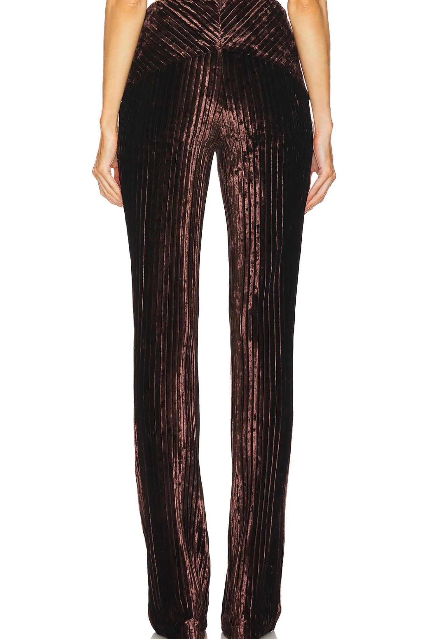 95% polyester 5% elastane.Made in China.Dry clean only.Hidden back zipper closure.Textured velvet fabric.Item not sold as set.15" at the knee breaks to 19" at the leg opening