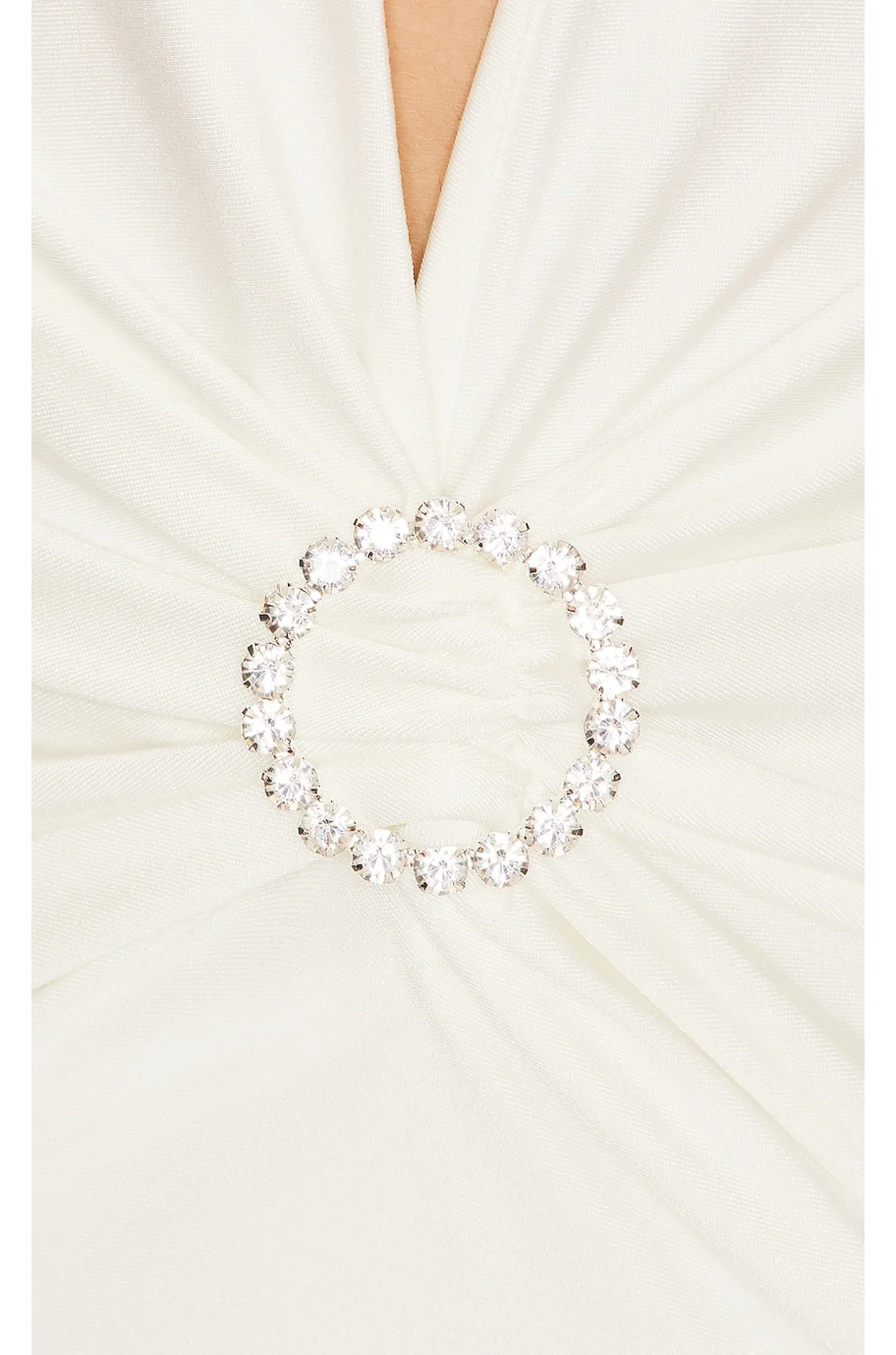 80% polyester 20% spandex.Made in London.Hand wash.Double lined.Hidden back zipper closure.Detachable scarf detail Front crystal embellished O-ring accent.Ruched spandex fabric with side seam slit