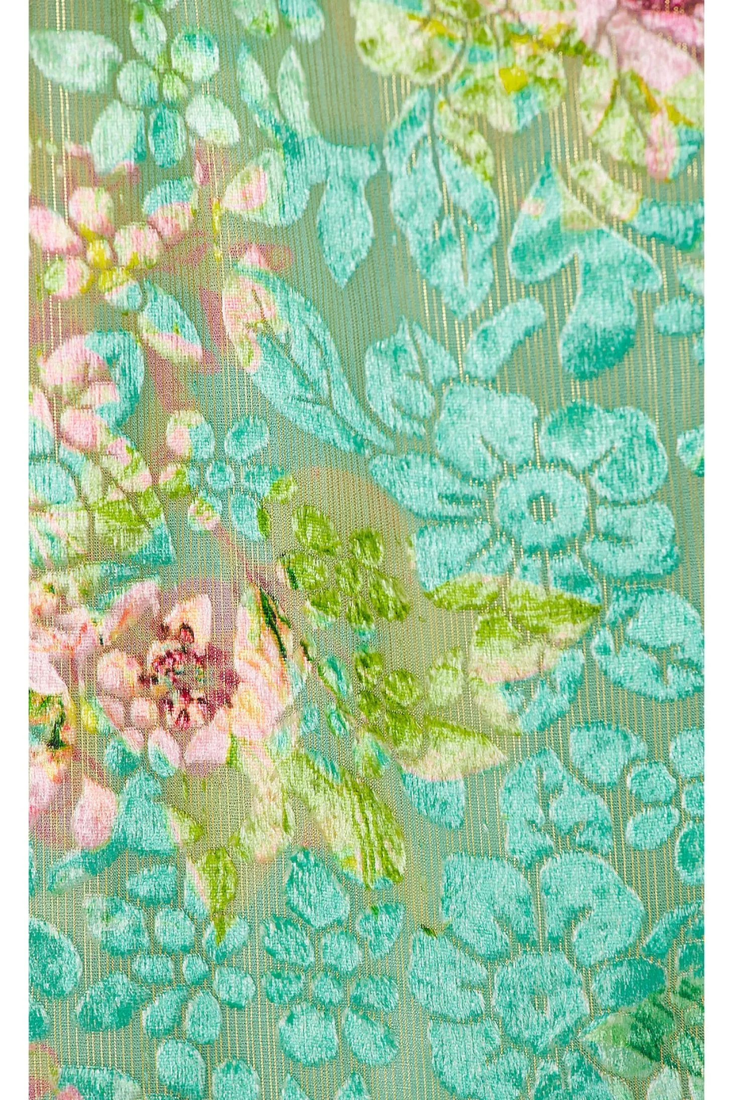 Self: 70% viscose 25% nylon 5% metallized fiber Lining: 100% viscose.Made in India.Dry clean only.Partially lined.Hidden side zipper closure Elastic waist with detachable belt.Puff sleeves with elastic cuffs.Velvet and mesh with metallic threading and side slit